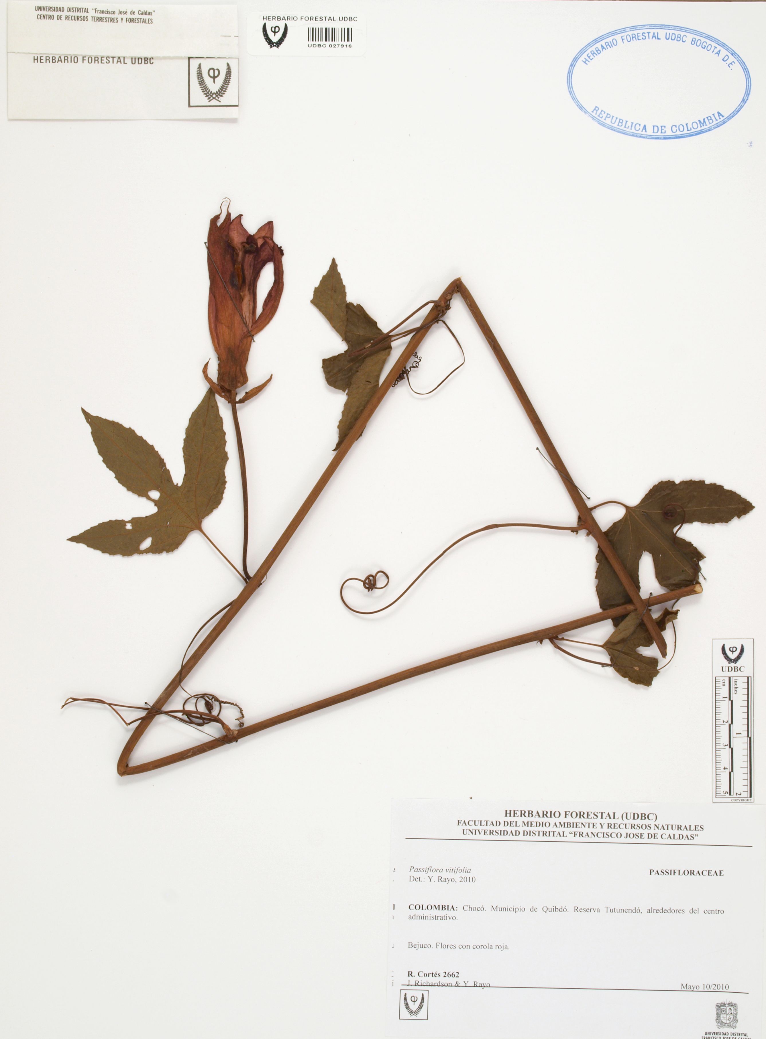 Fotografía del ejemplar Cortés-B., R. 2662, determinado como Passiflora vitifolia en el año 2010