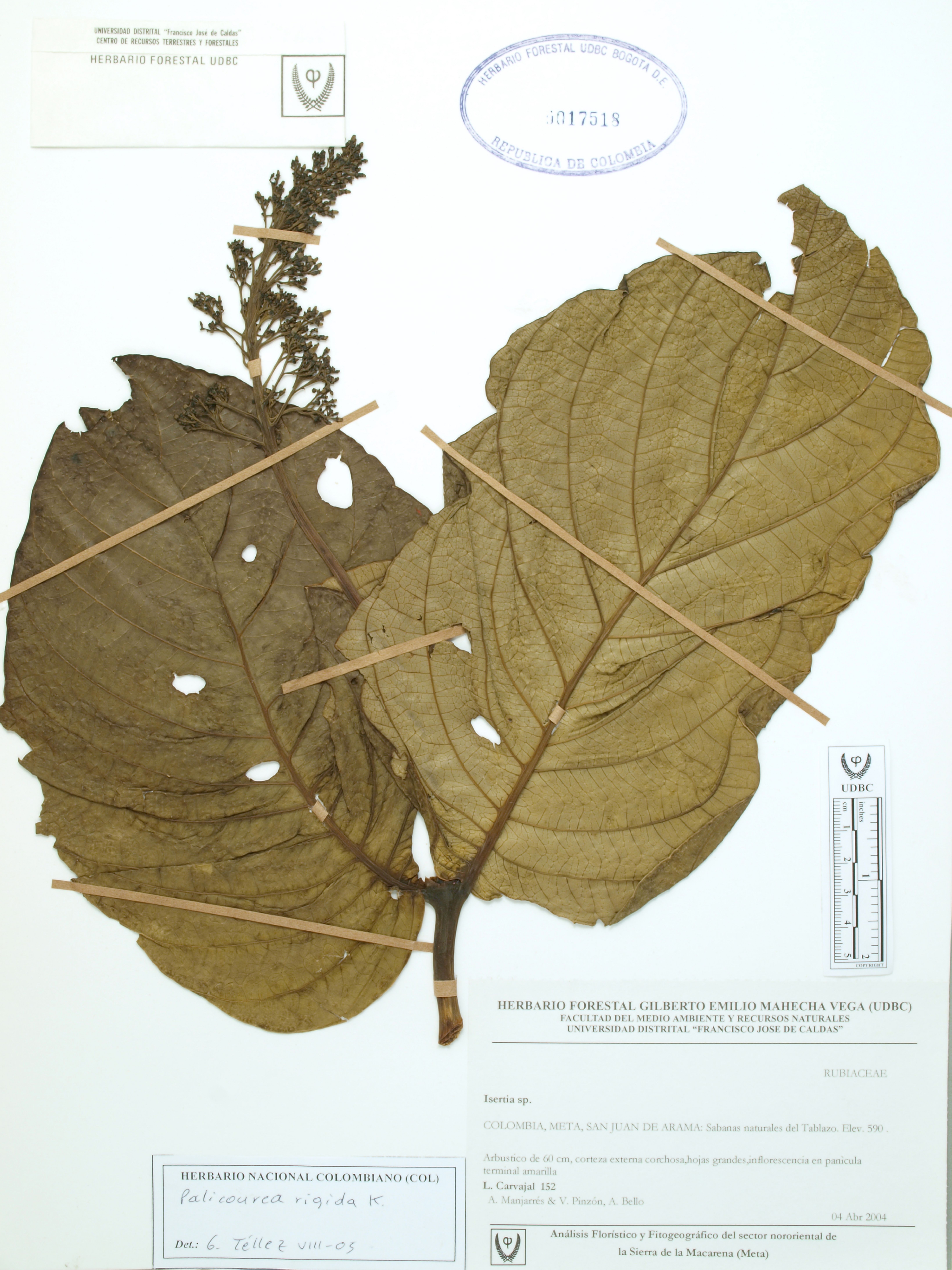 Fotografía del ejemplar Carvajal, L. 152, determinado como Palicourea rigida en el año 2005
