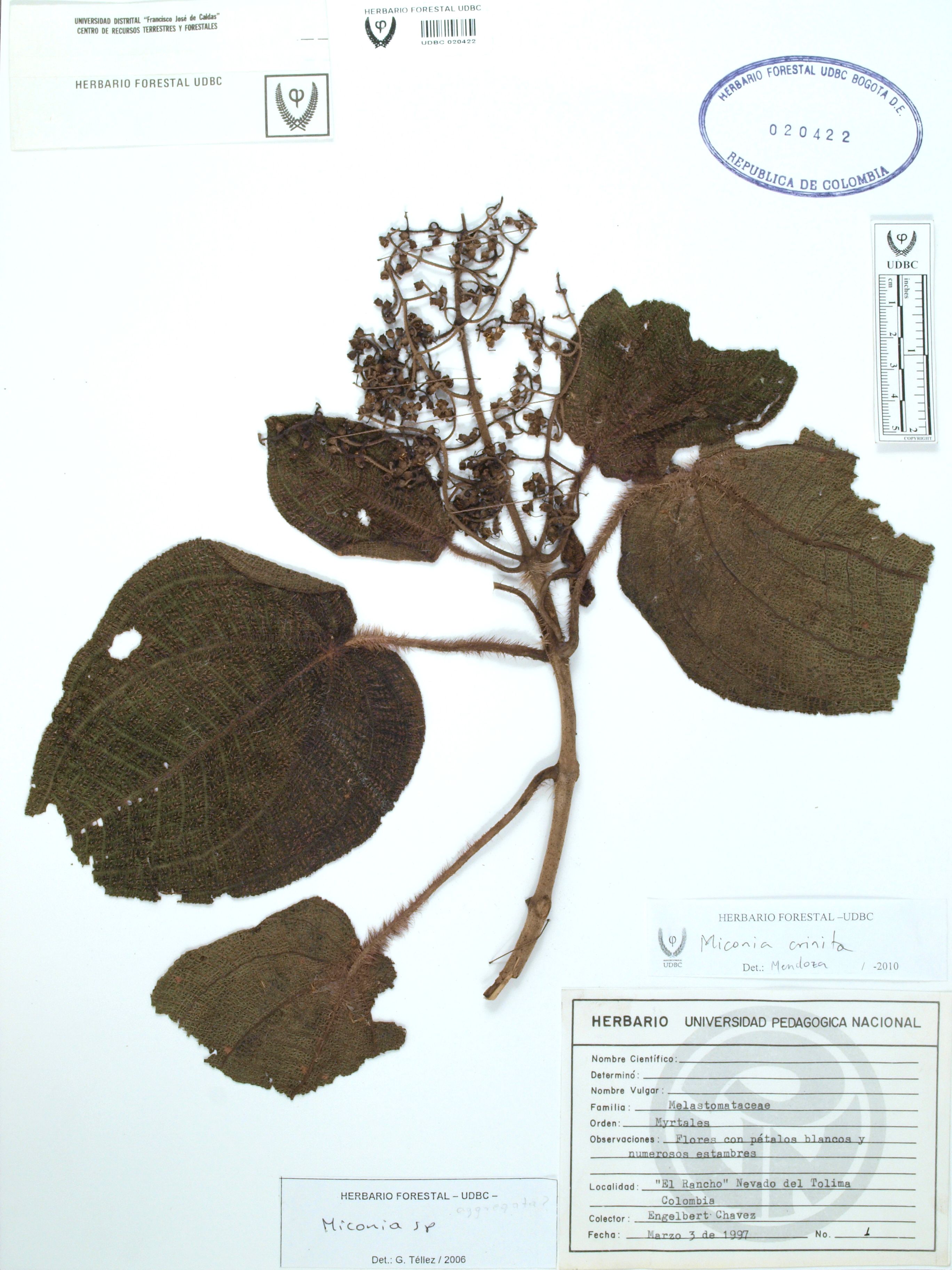 Fotografía del ejemplar Chávez, E. 1, determinado como Miconia crinita en el año 2010