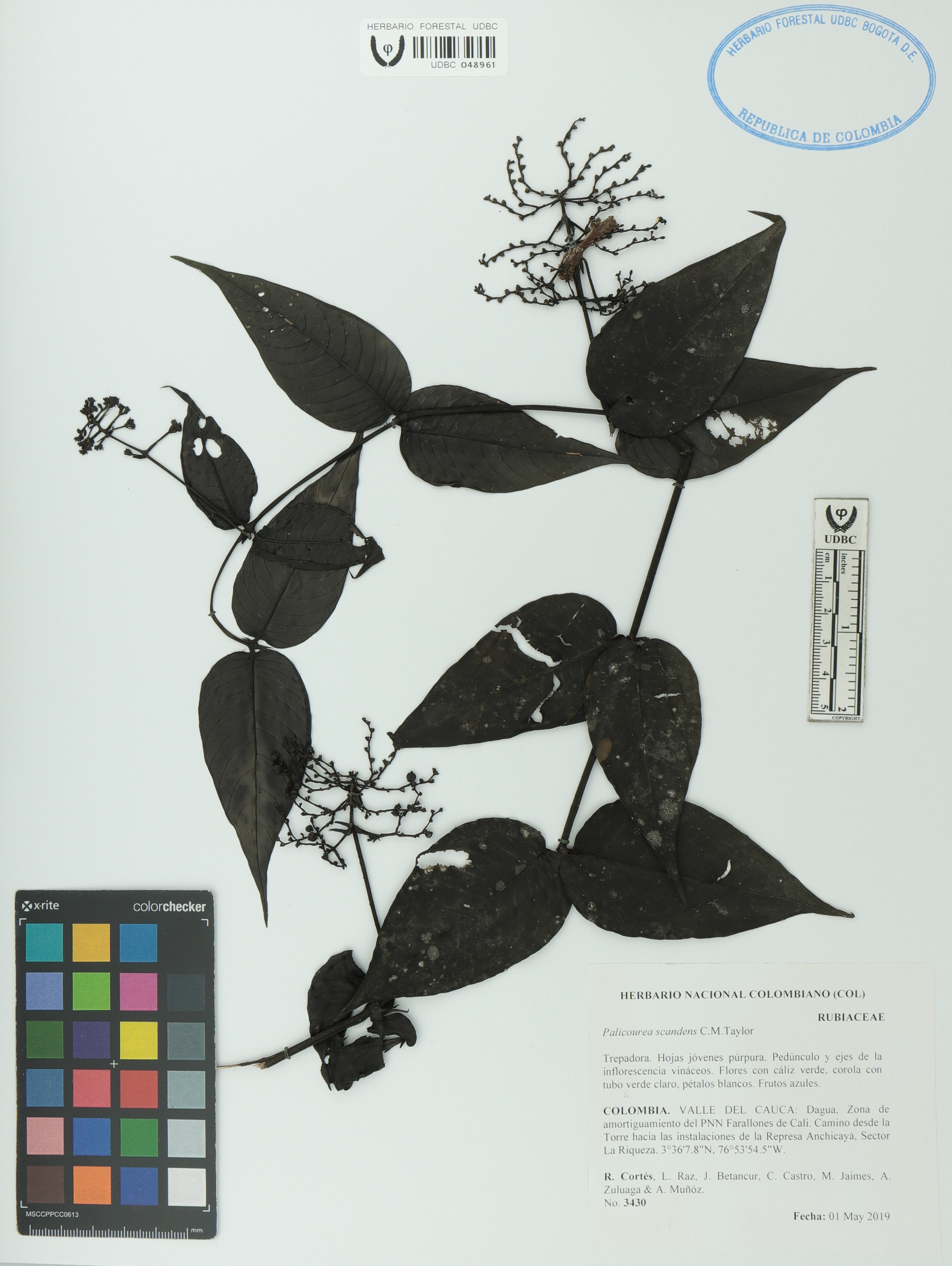 Fotografía del ejemplar Cortés, R. 3430, determinado como Palicourea scandens en el año 2019