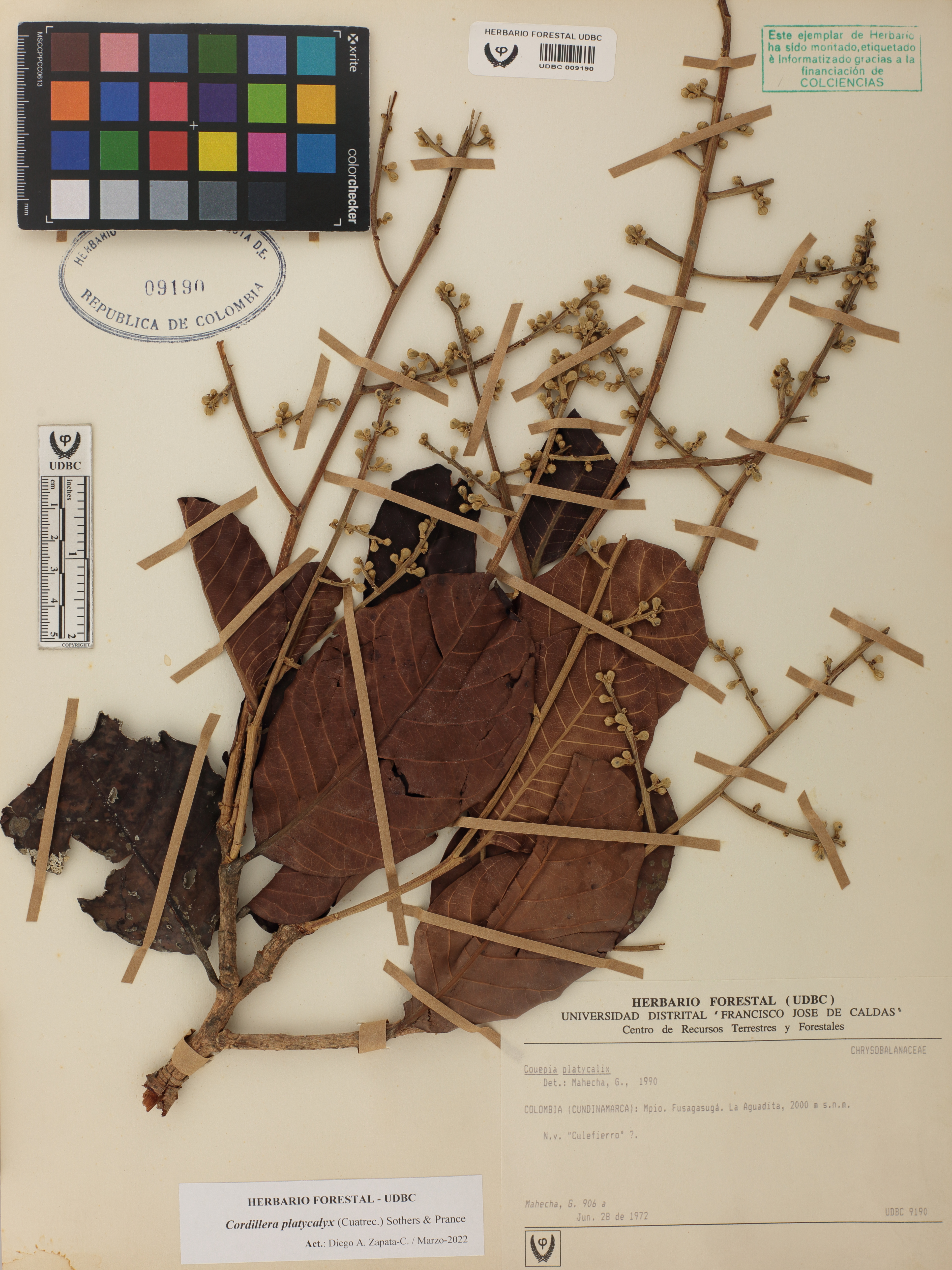 Fotografía del ejemplar Mahecha, G. 906, determinado como Cordillera platycalyx en el año 1990