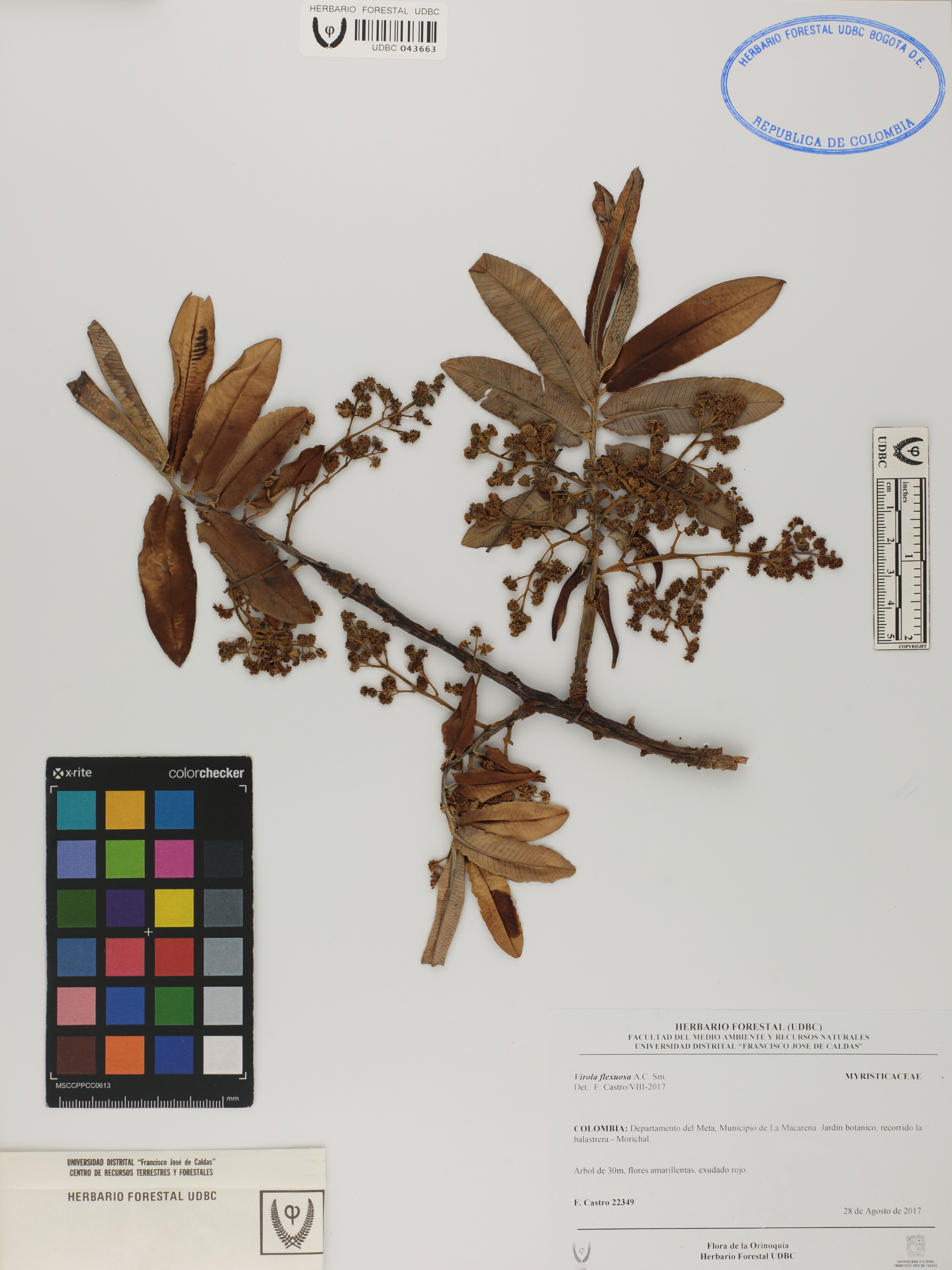 Fotografía del ejemplar Castro, F. 22349, determinado como Virola flexuosa en el año 2017