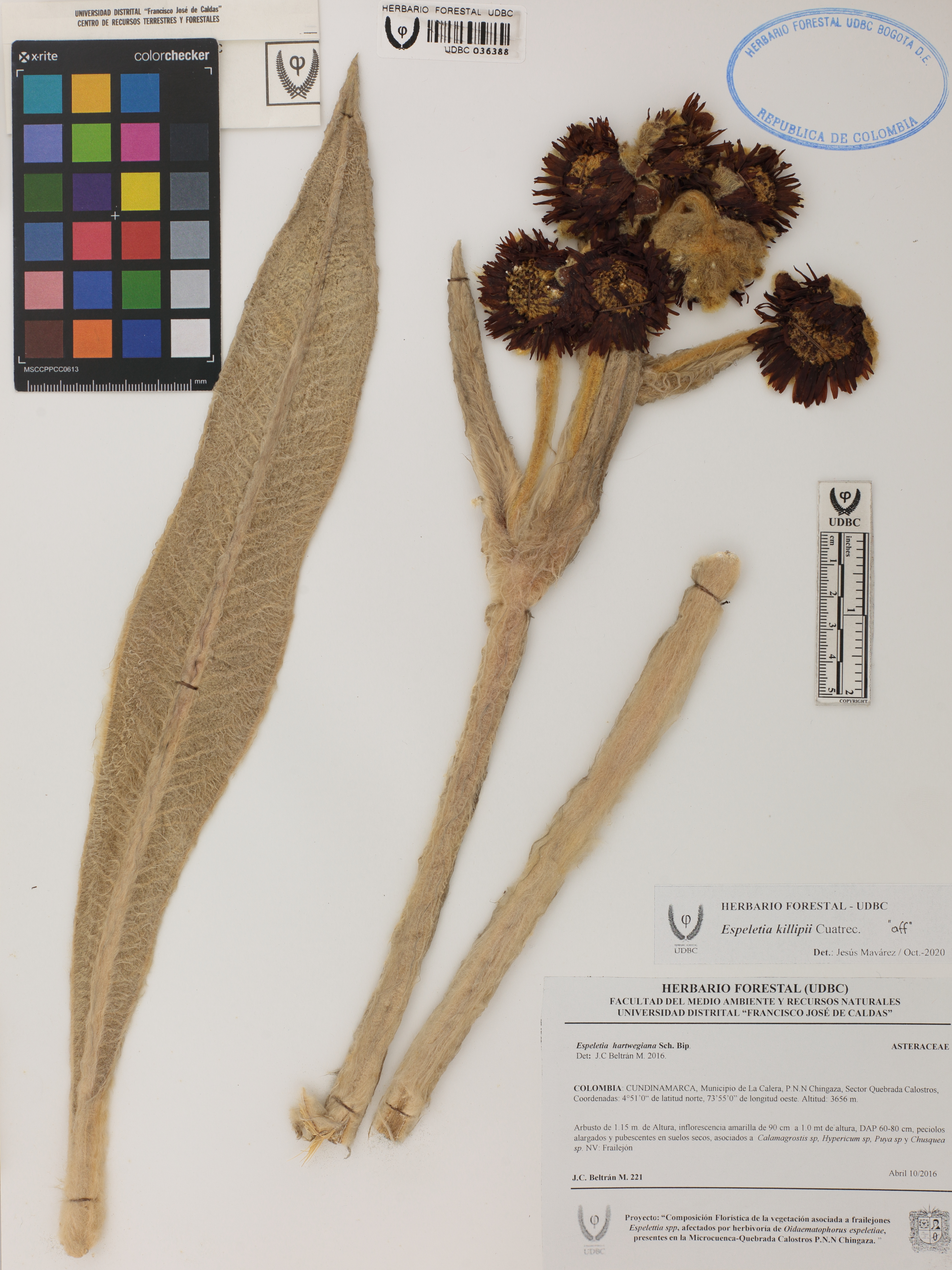 Fotografía del ejemplar Beltrán, J. 221, determinado como Espeletia killipii en el año 2020