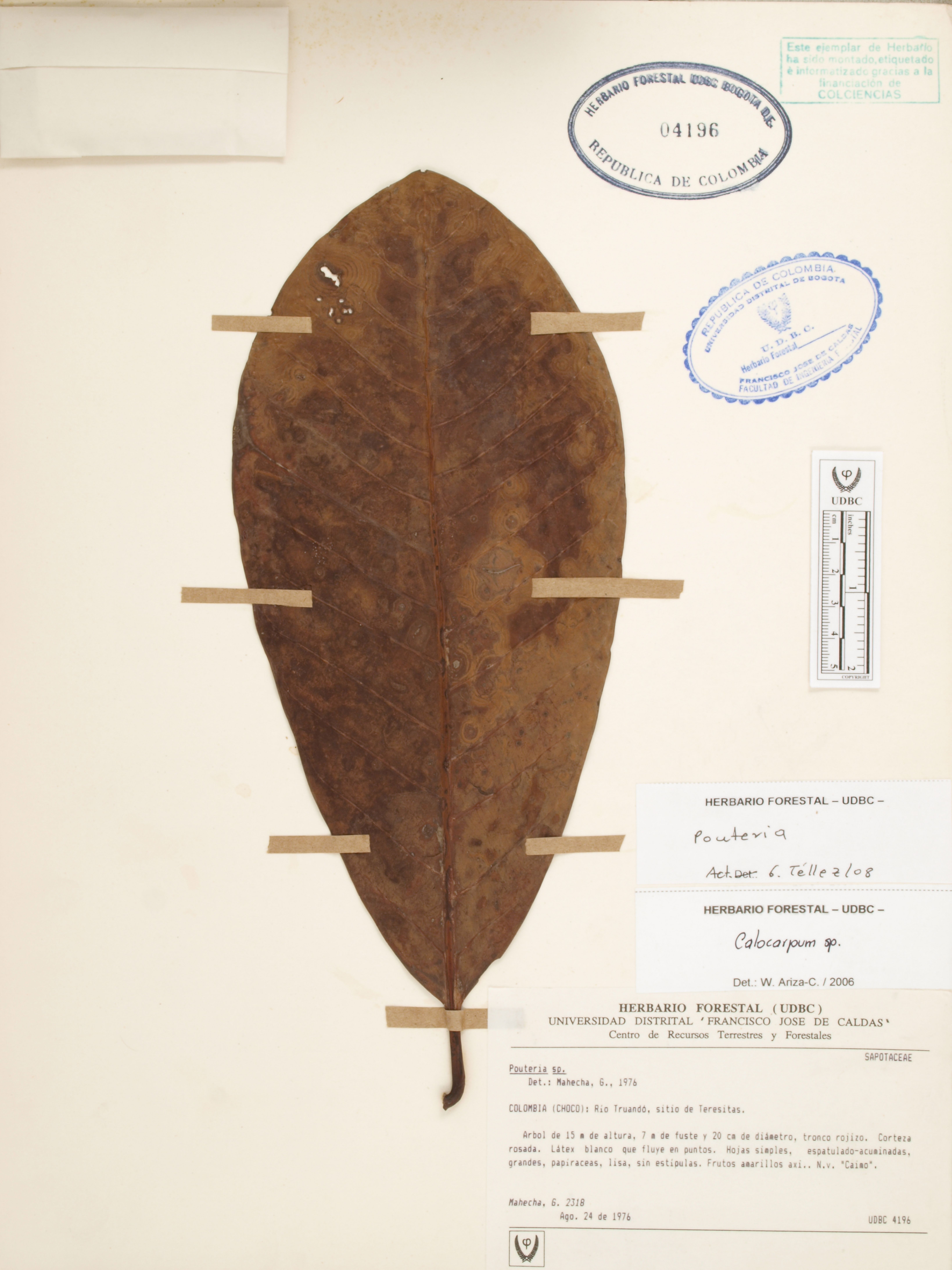 Fotografía del ejemplar Mahecha, G. 2318, determinado como Pouteria sp. en el año 2006