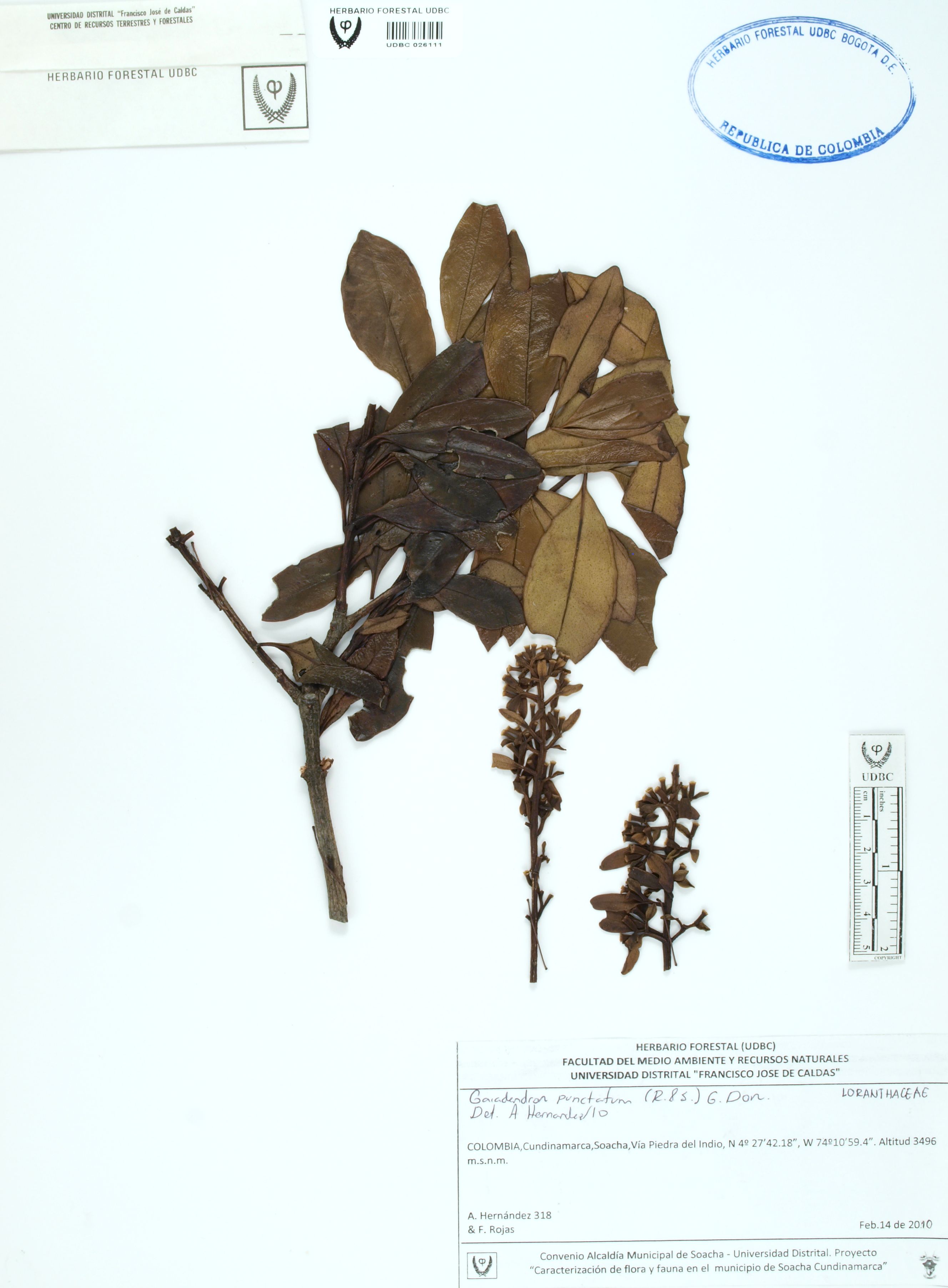 Fotografía del ejemplar Hernández, A. 318, determinado como Gaiadendron punctatum en el año 2010