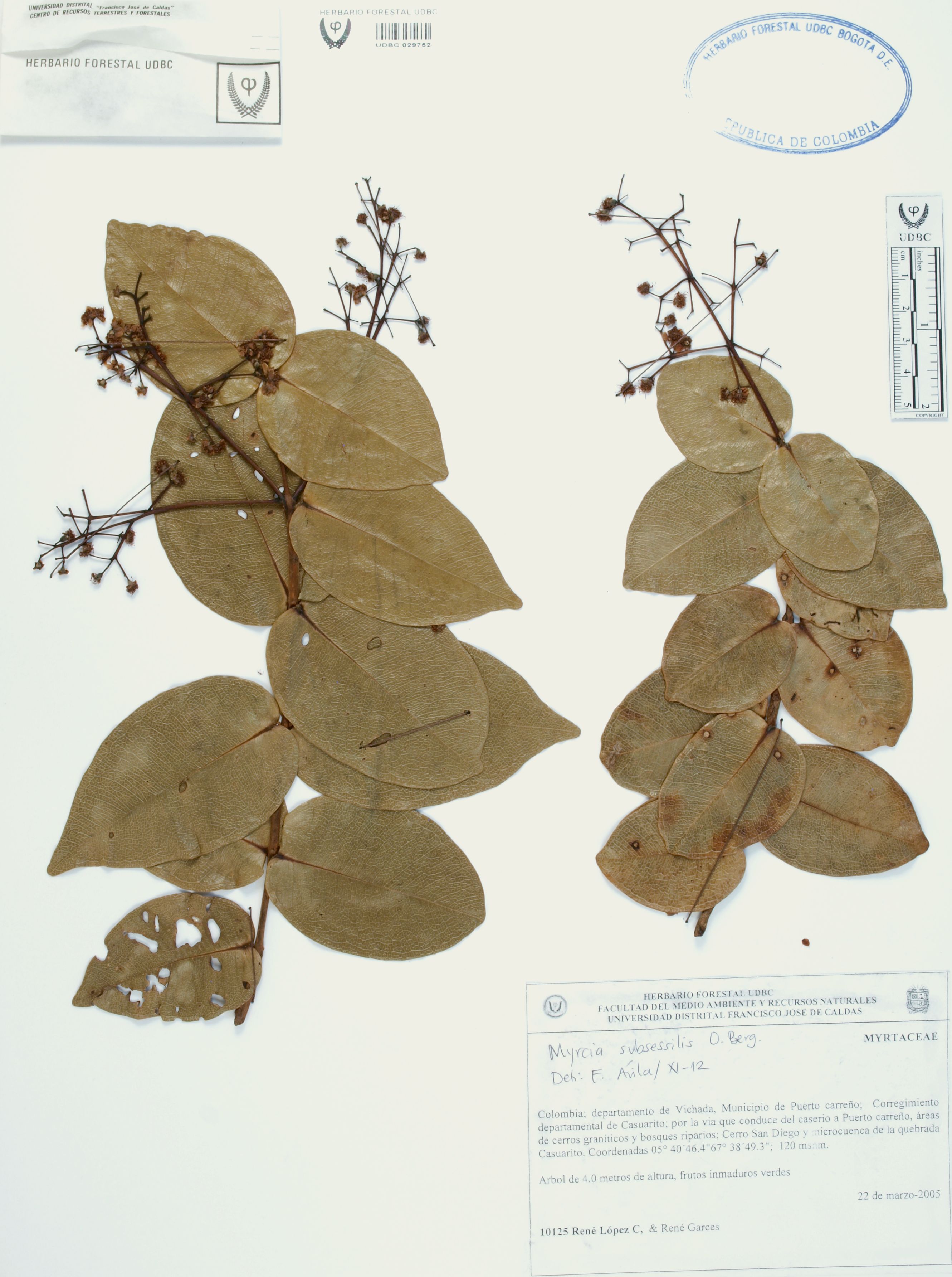 Fotografía del ejemplar López, R. 10125, determinado como Myrcia subsessilis en el año 2012