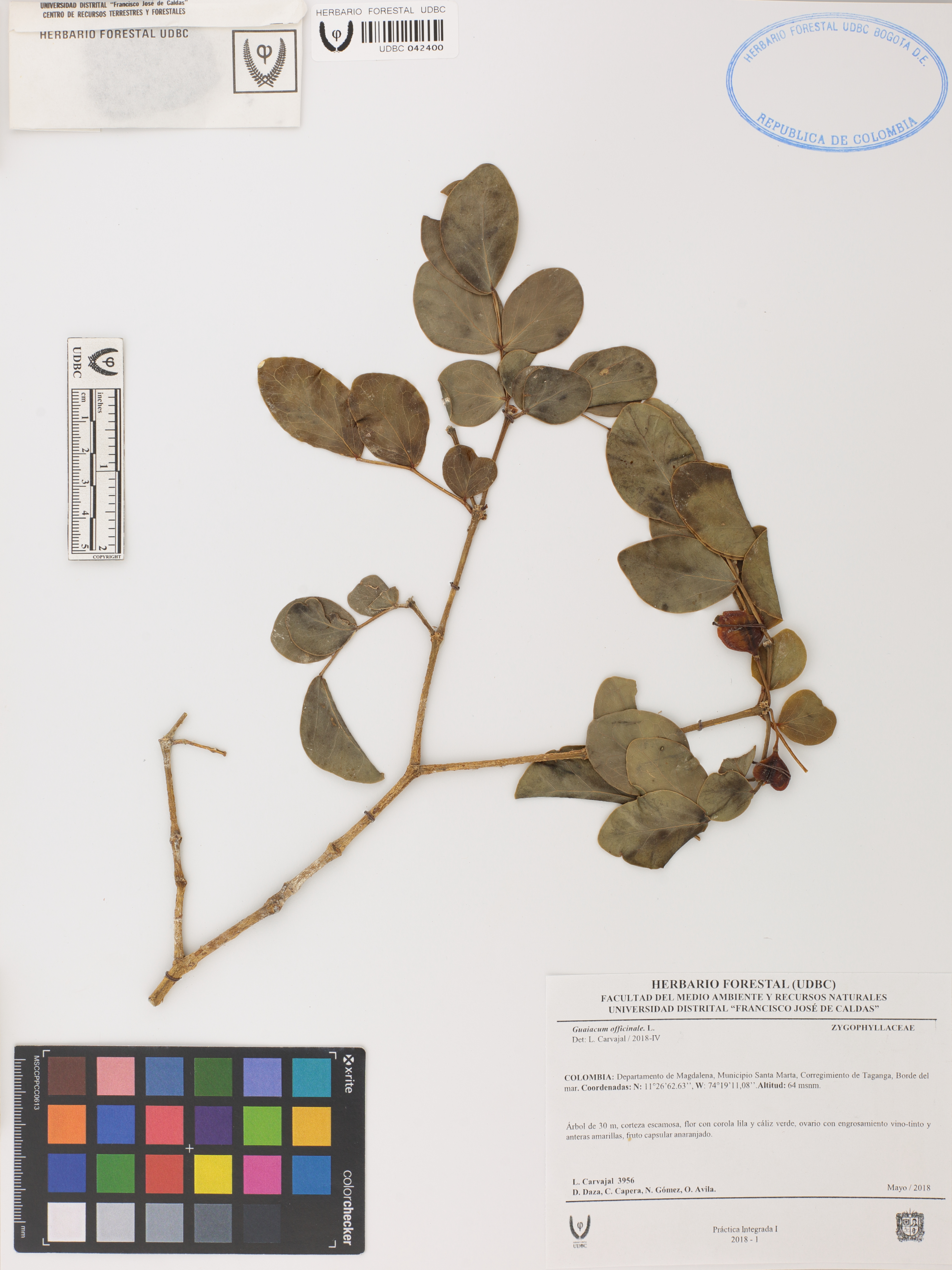 Fotografía del ejemplar Carvajal, L. 3956, determinado como Guaiacum officinale en el año 2018