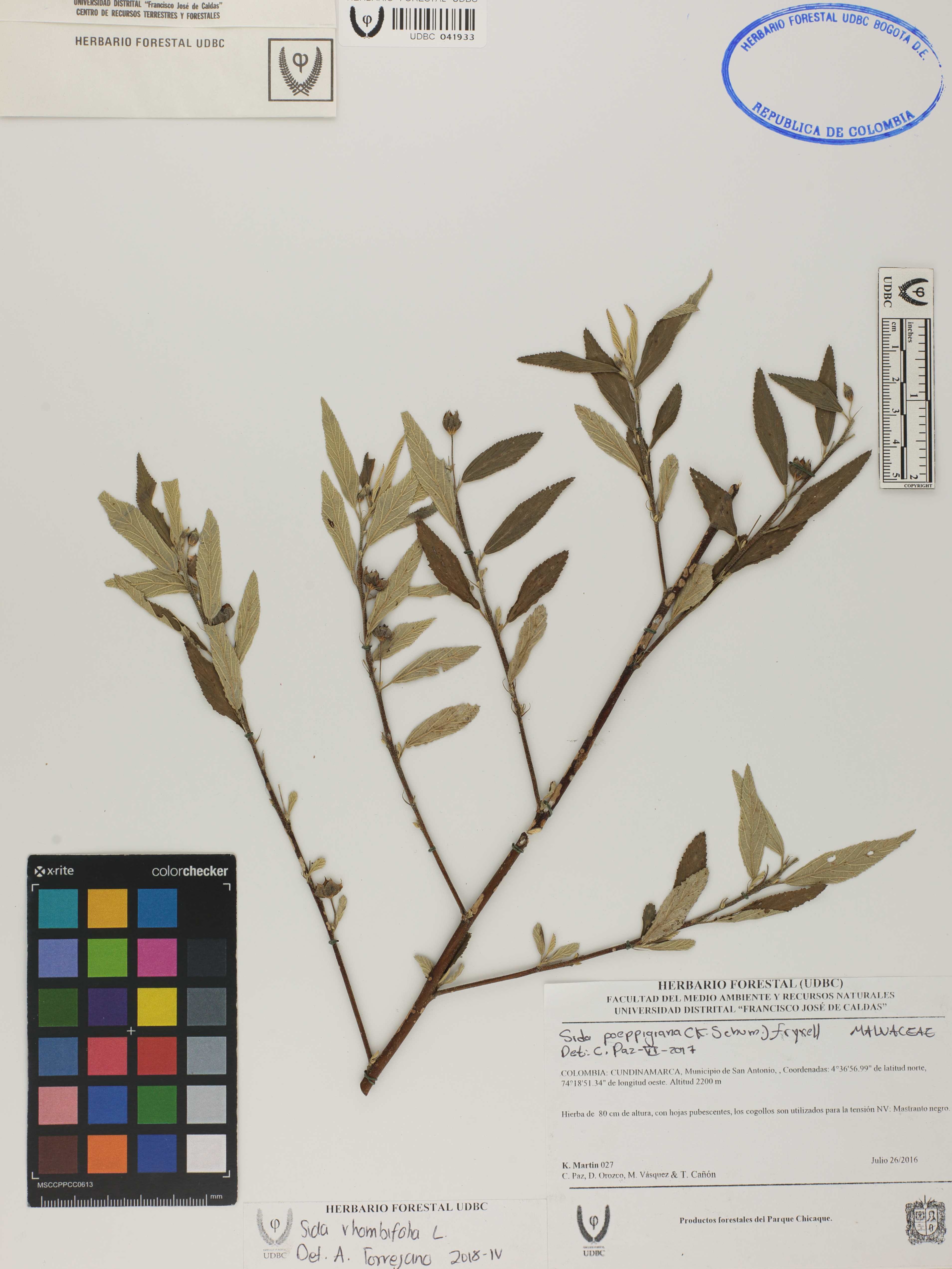 Fotografía del ejemplar Martín, K. 27, determinado como Sida rhombifolia en el año 2018