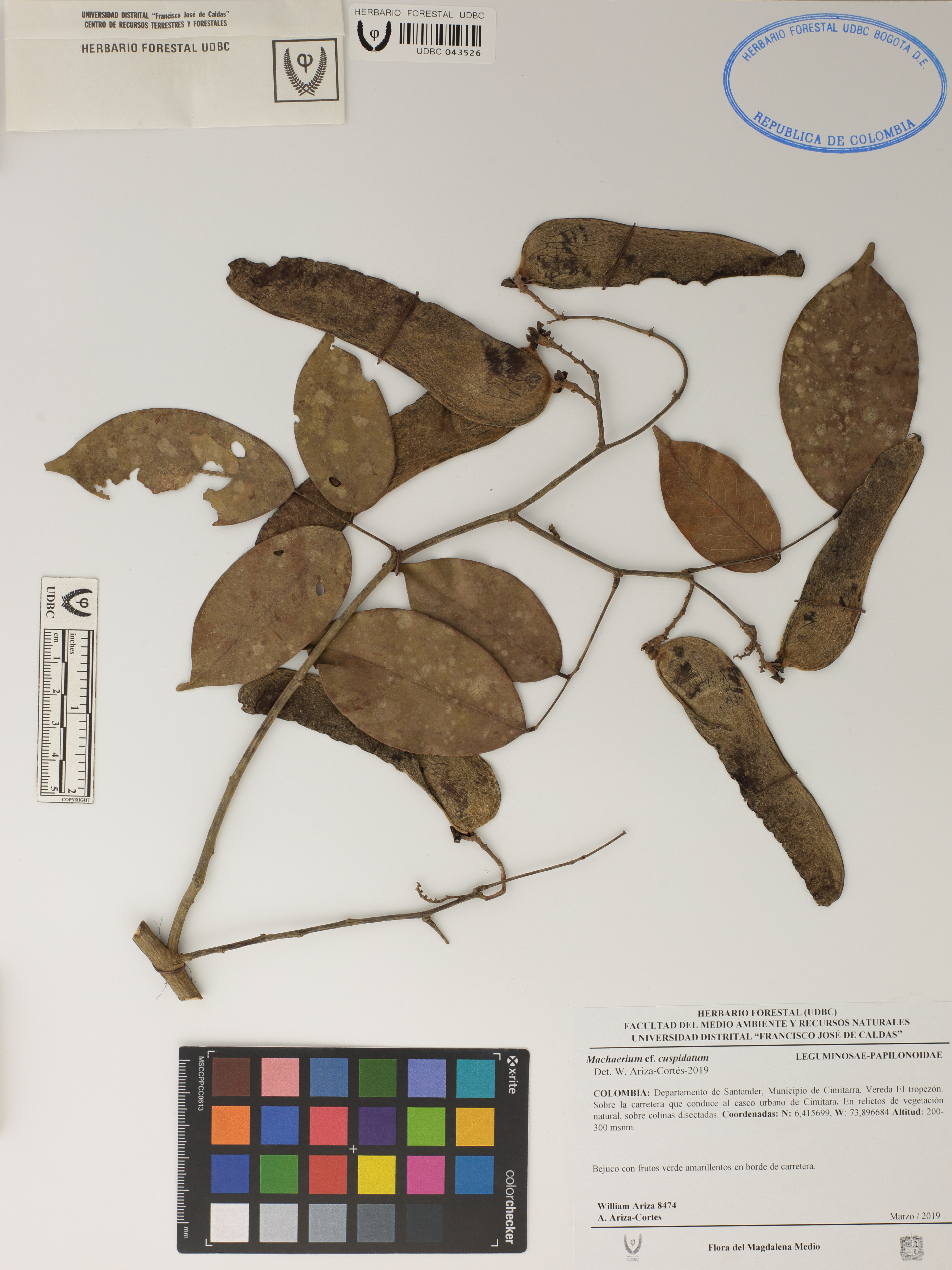 Fotografía del ejemplar Ariza, W. 8474, determinado como Machaerium cuspidatum en el año 2019