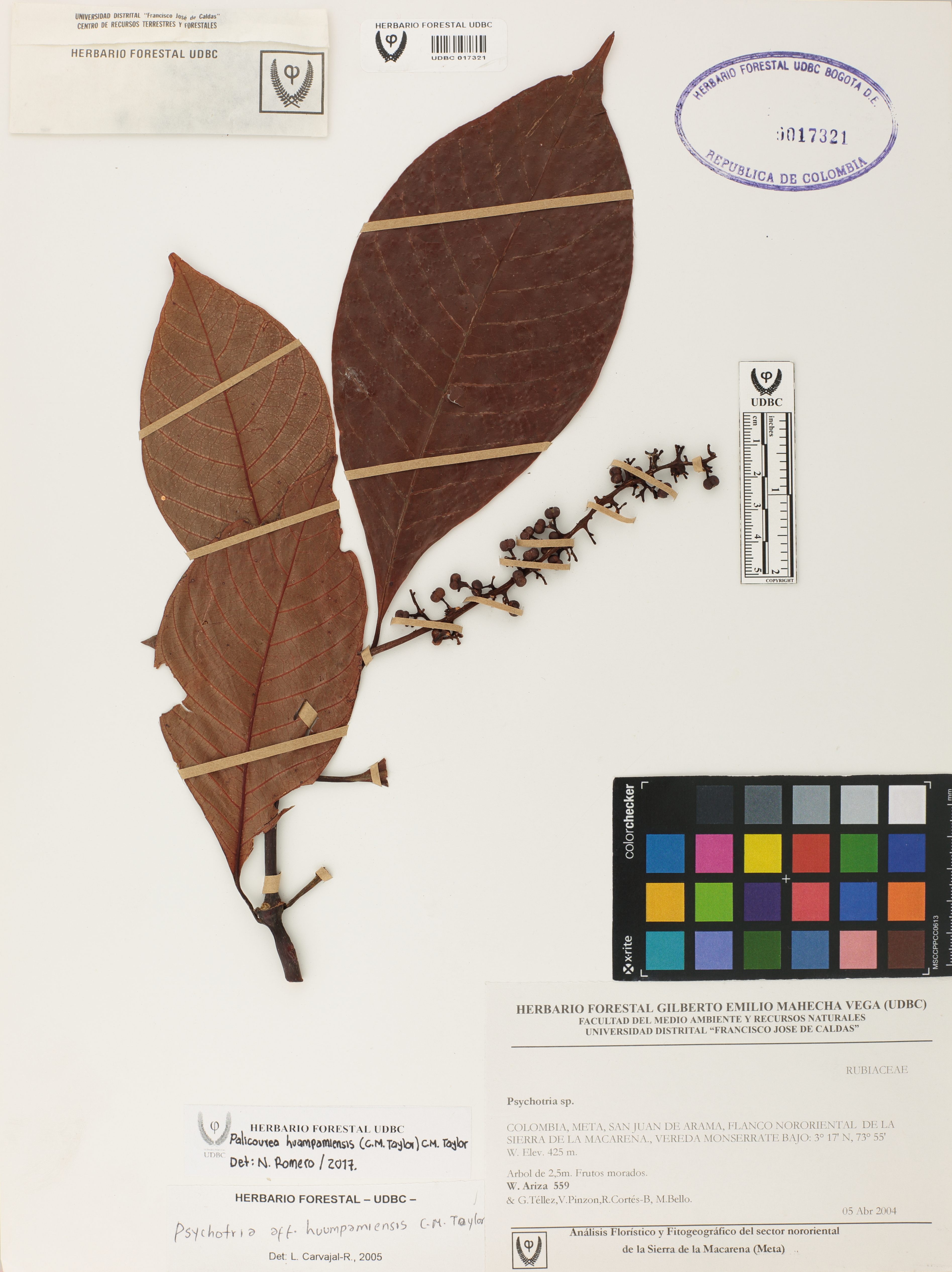 Fotografía del ejemplar Ariza, W. 559, determinado como Palicourea huampamiensis en el año 2017