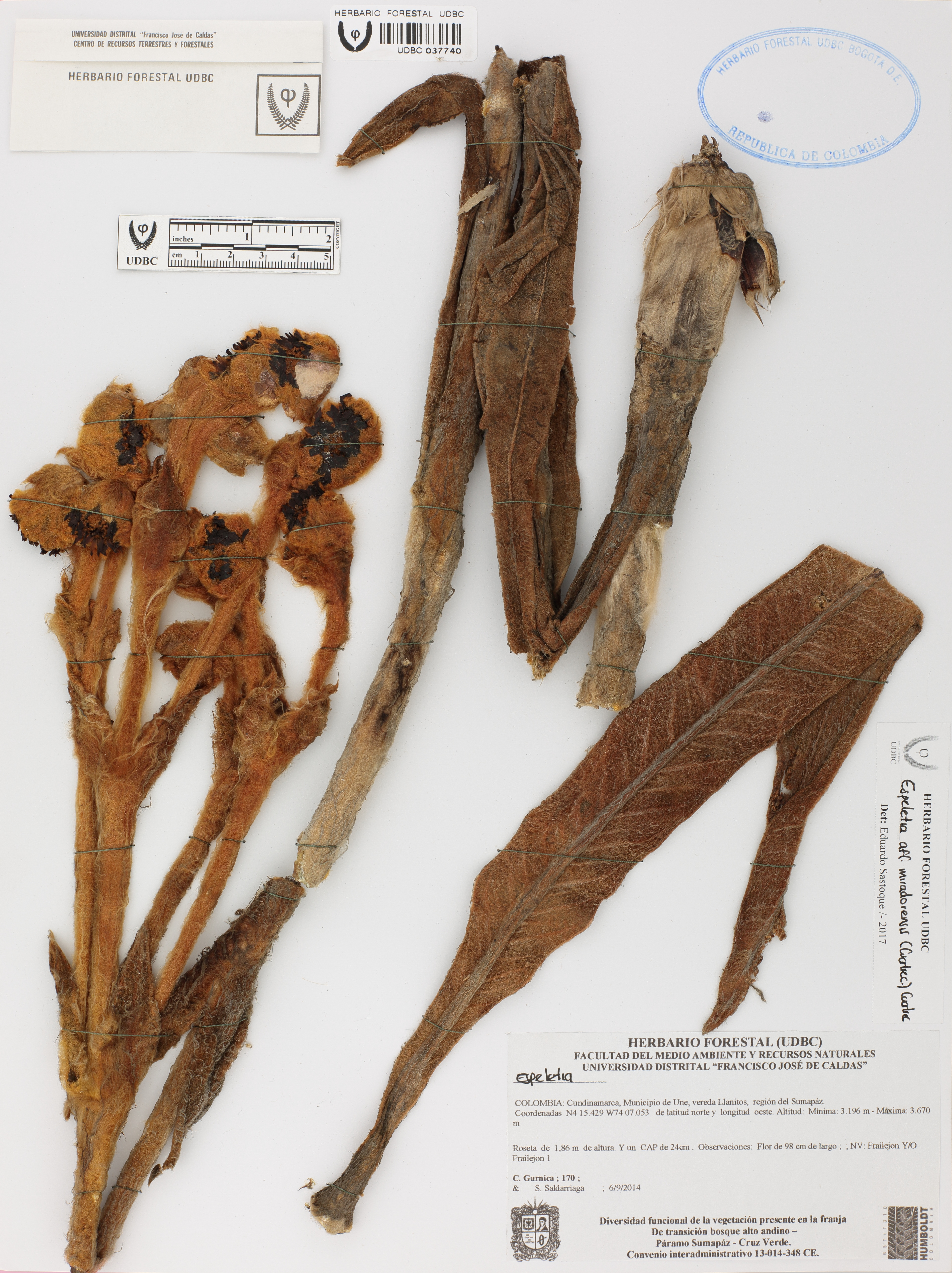 Fotografía del ejemplar Garnica, C. 170, determinado como Espeletia miradorensis en el año 2017