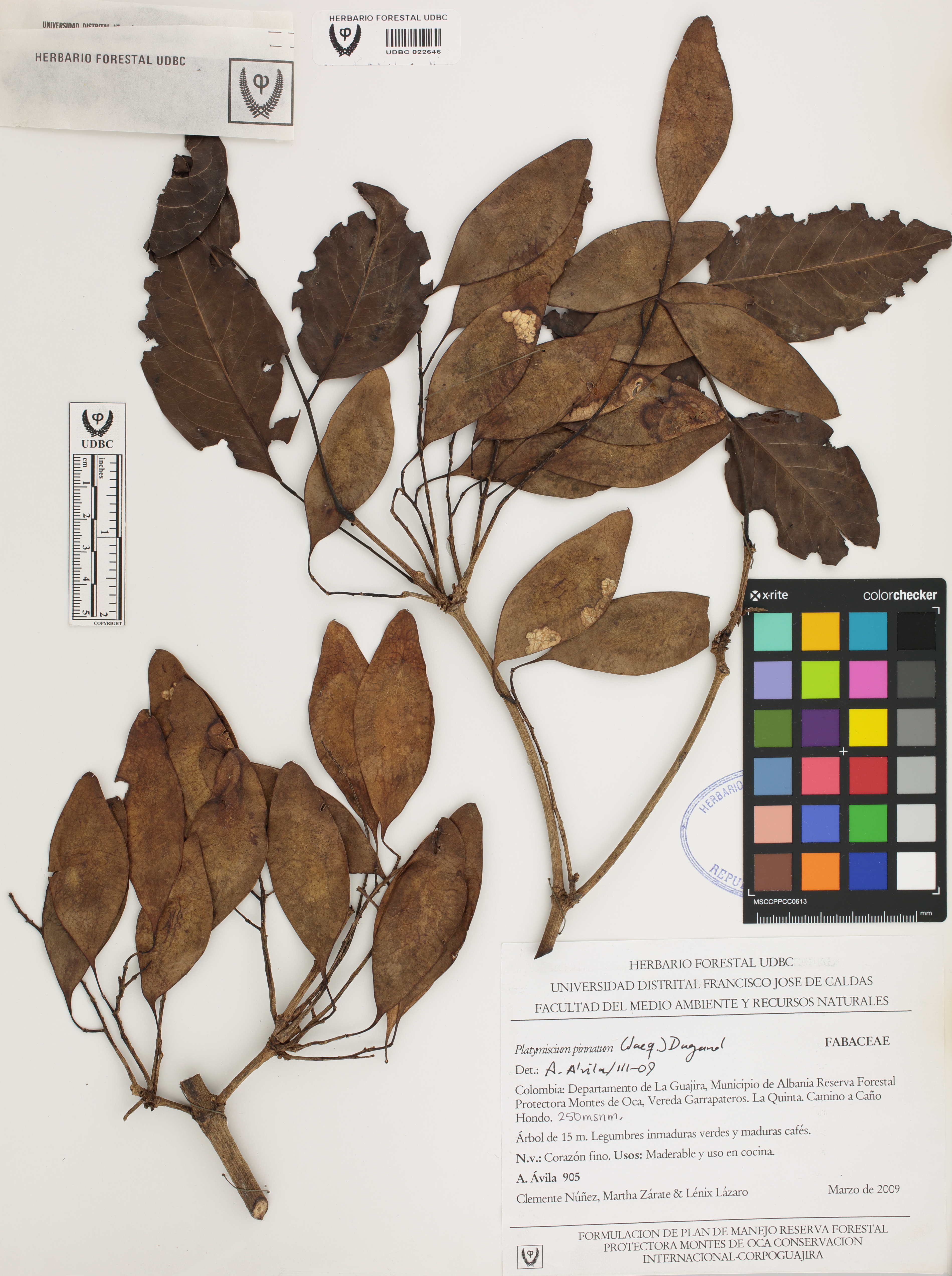 Fotografía del ejemplar Ávila, F. 905, determinado como Platymiscium pinnatum en el año 2009
