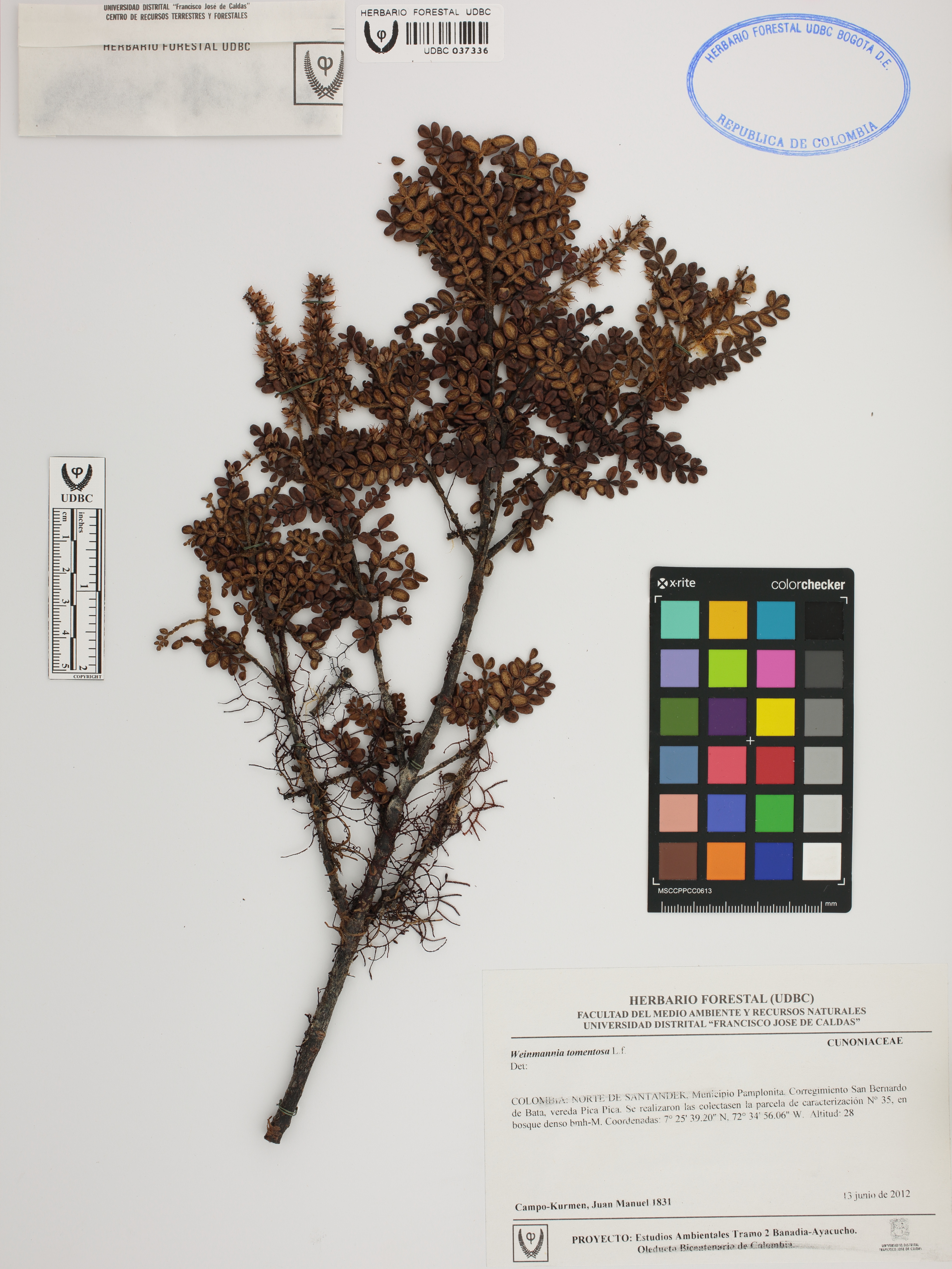 Fotografía del ejemplar Campo-Kurmen, J. 1831, determinado como Weinmannia tomentosa