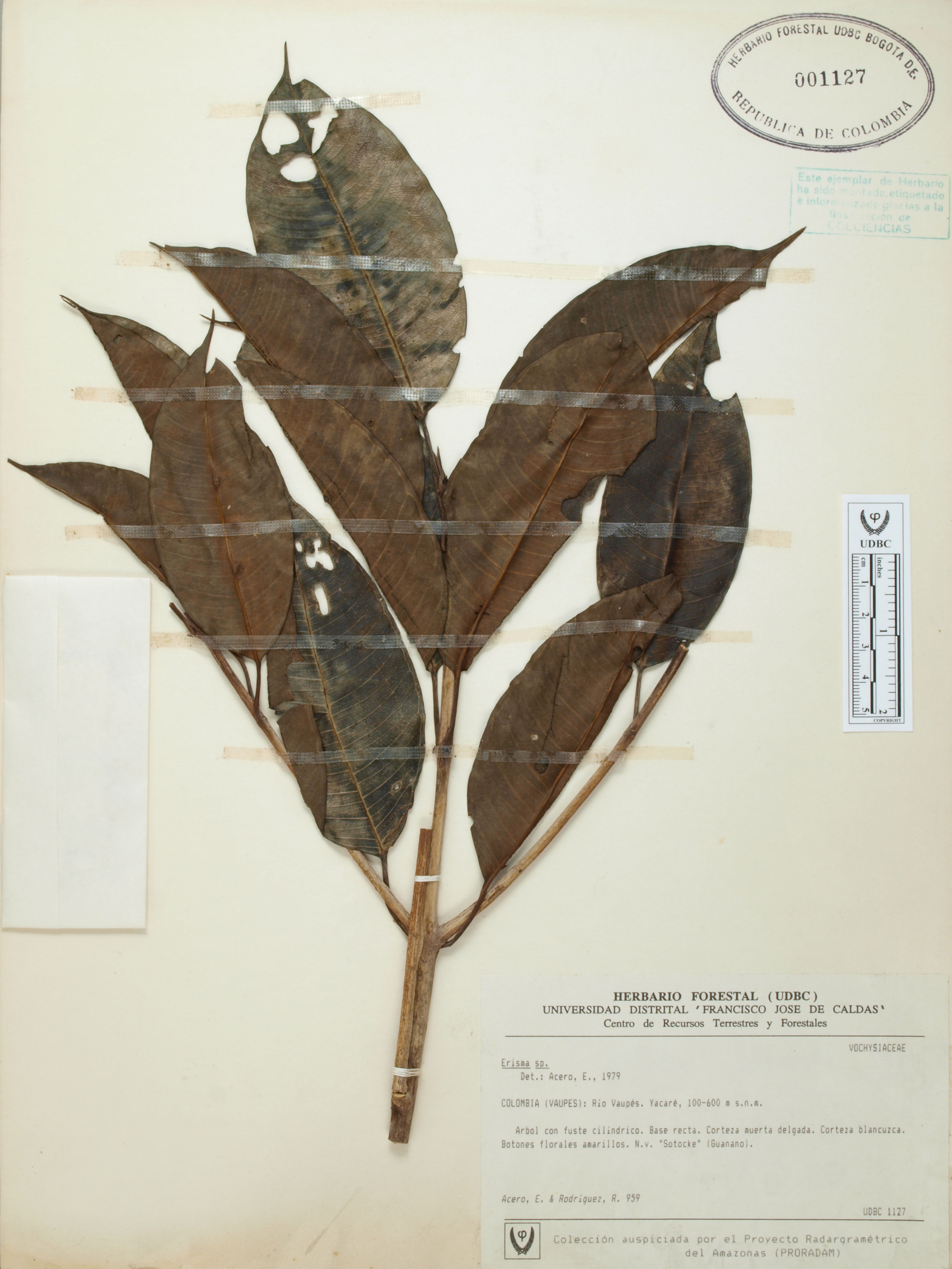Fotografía del ejemplar Acero, E. 959, determinado como Erisma sp. en el año 1979