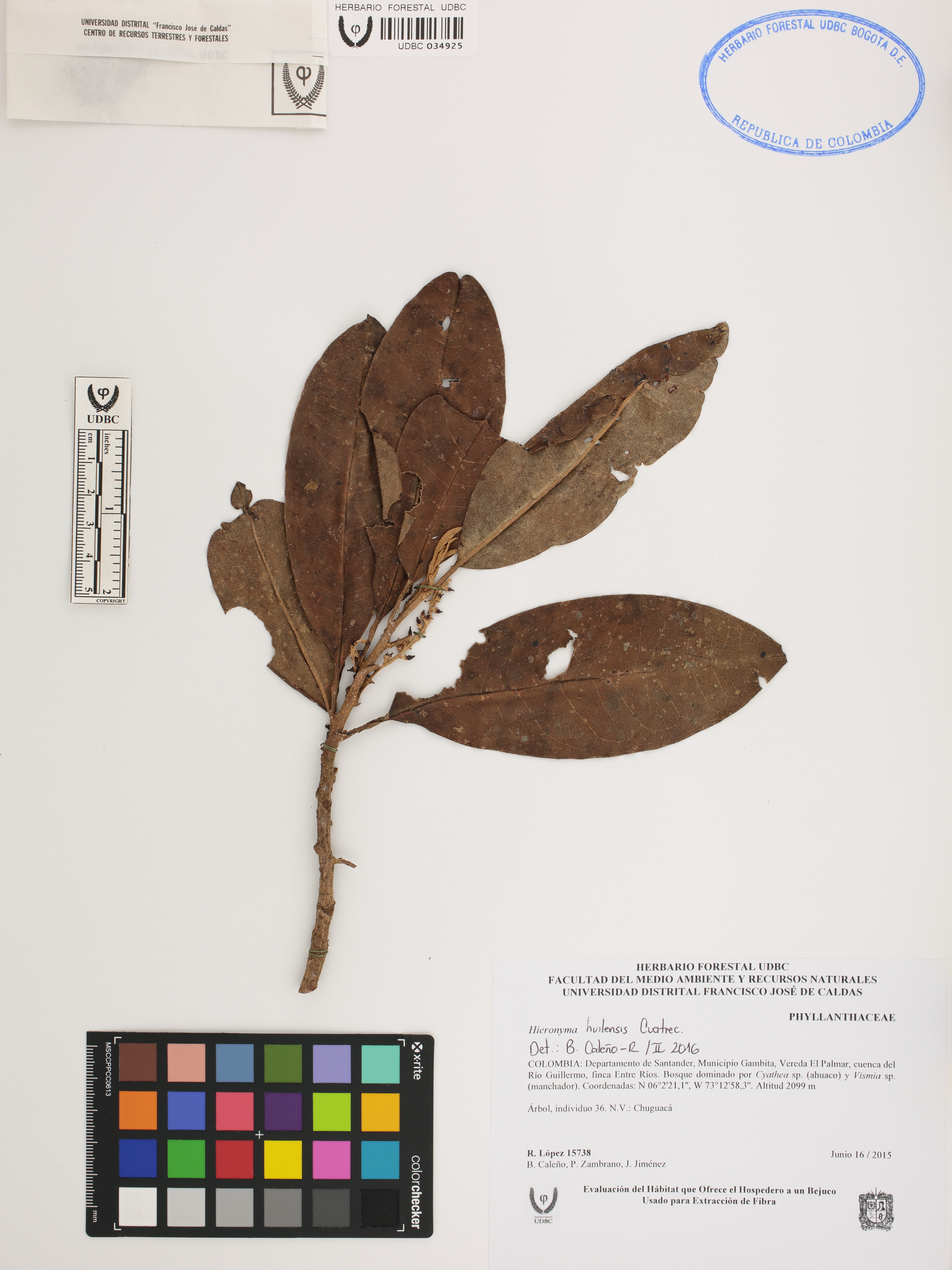 | dc.description | Fotografía del ejemplar López, R. 15738, determinado como Hieronyma huilensis en el año 2016 | |