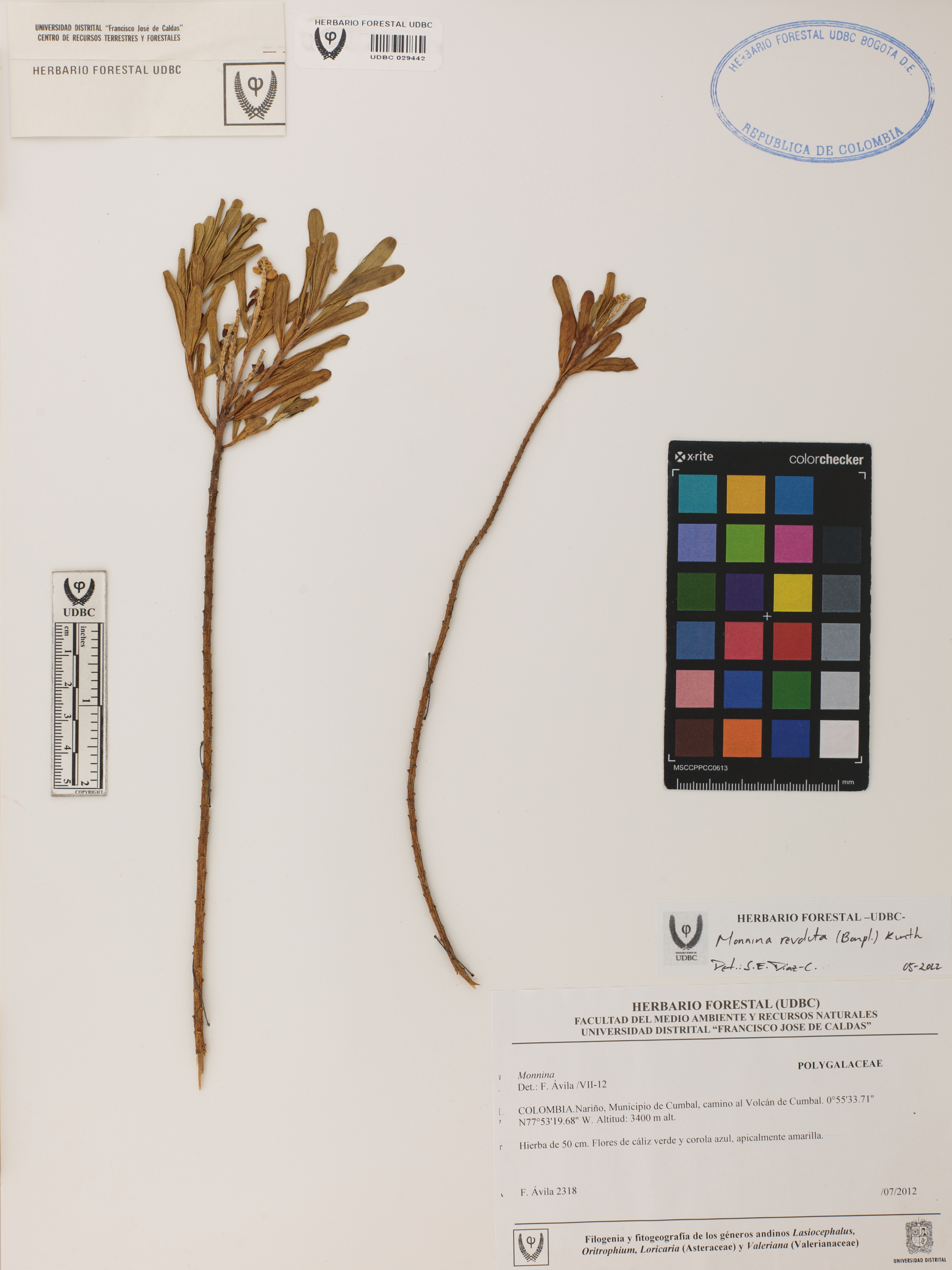 Fotografía del ejemplar Ávila, F. 2318, determinado como Monnina revoluta en el año 2022
