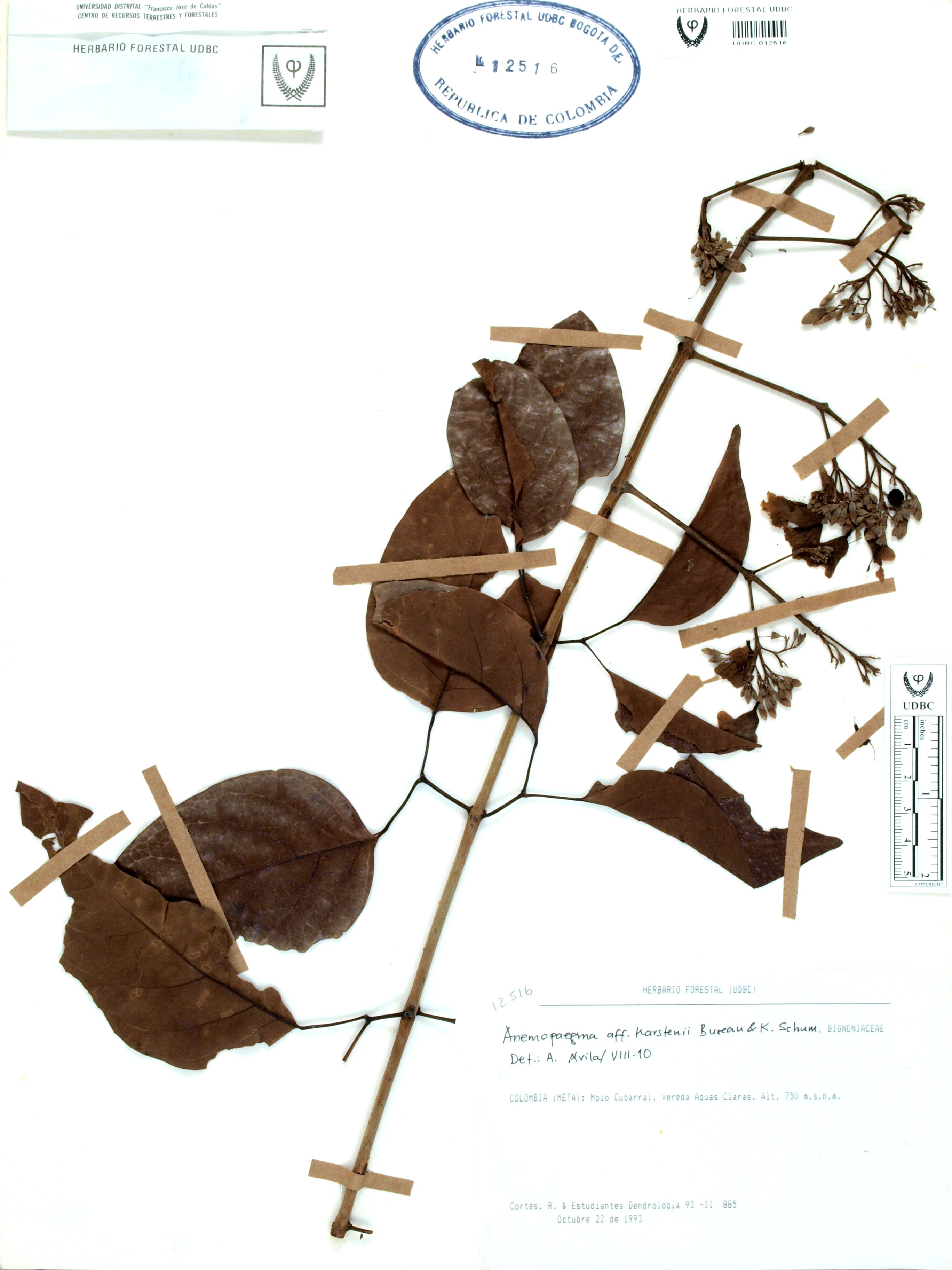 Fotografía del ejemplar Cortés, R. 885, determinado como Anemopaegma karstenii en el año 2010