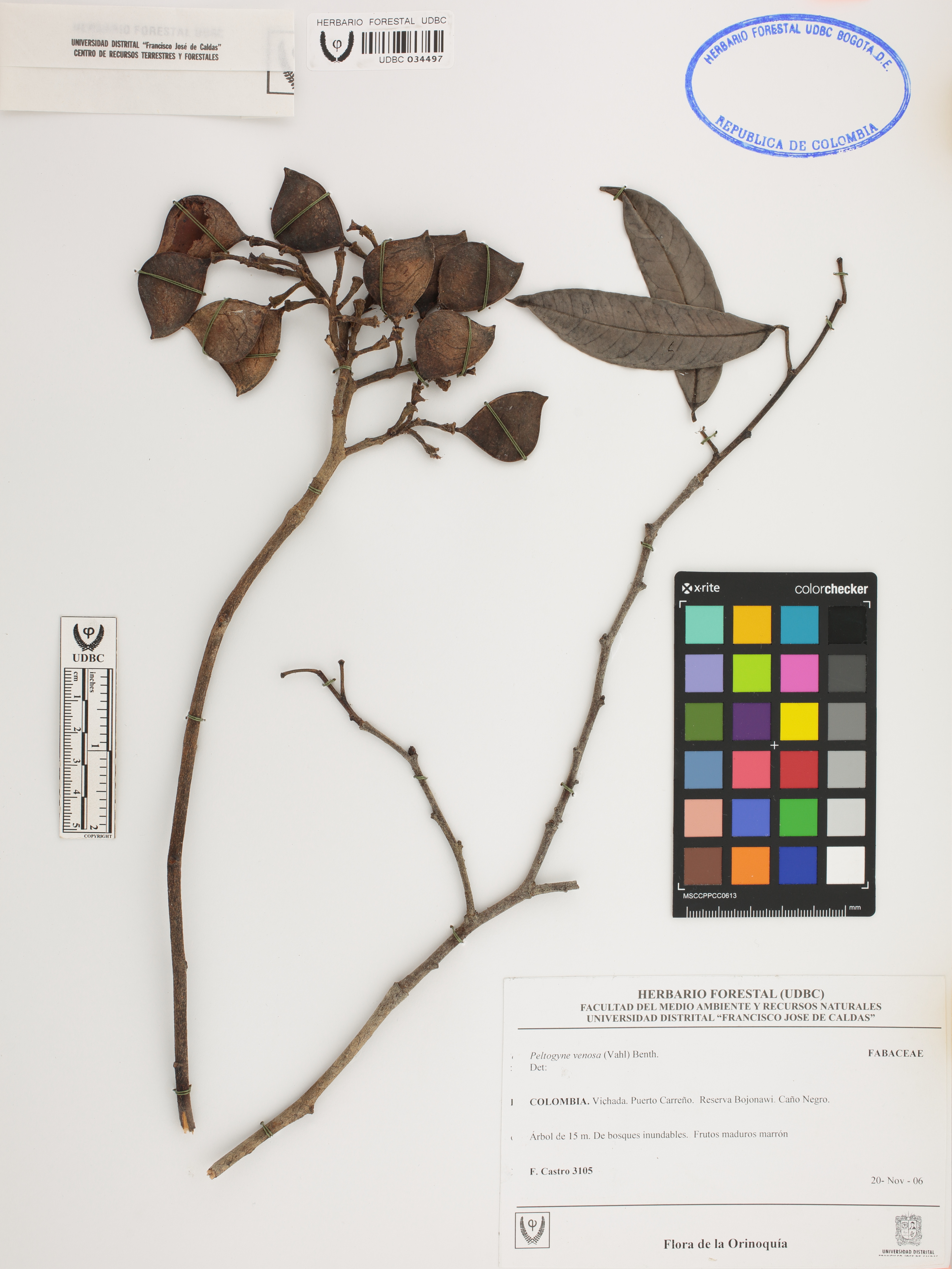 | dc.description | Fotografía del ejemplar Castro, F. 3105, determinado como Peltogyne venosa | |