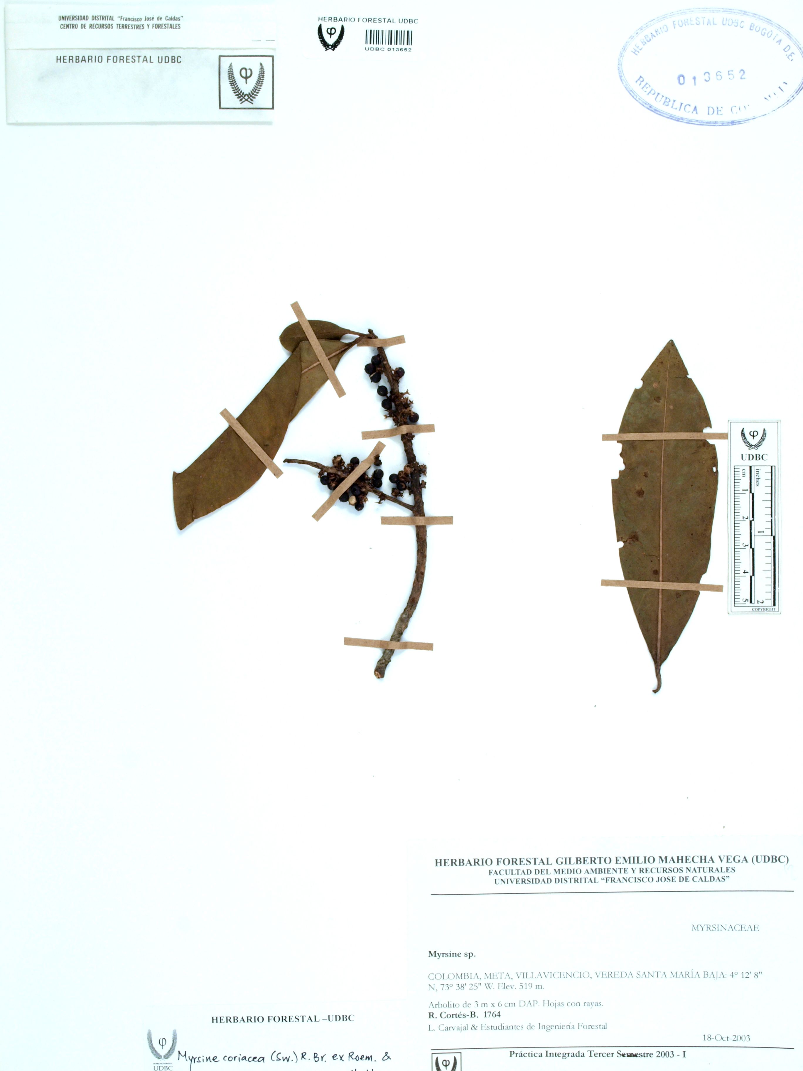 | dc.description | Fotografía del ejemplar Cortés-B., R. 1764, determinado como Myrsine sp. en el año 2023 | |