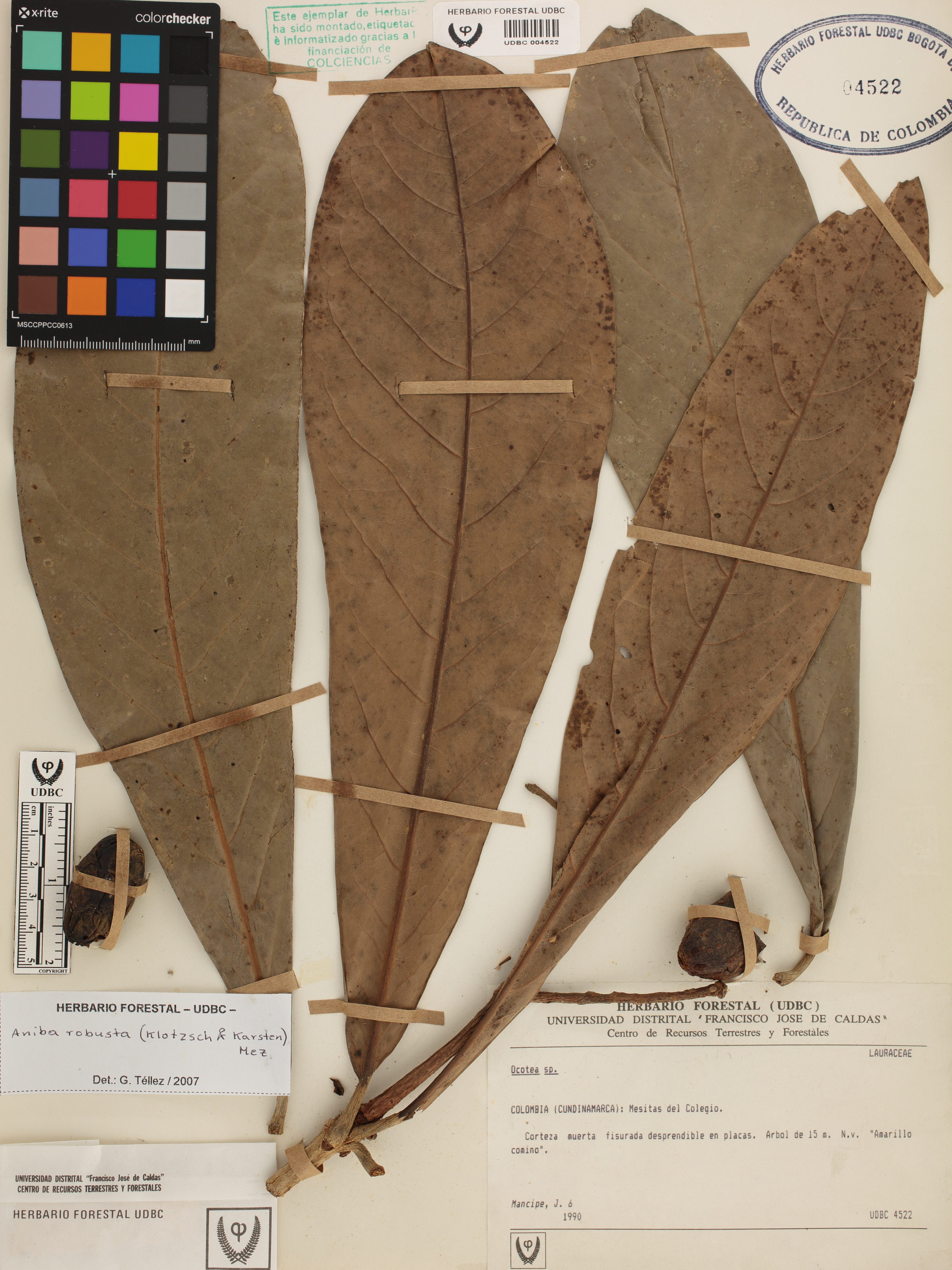 Fotografía del ejemplar Mancipe, J. 6, determinado como Aniba robusta en el año 2007