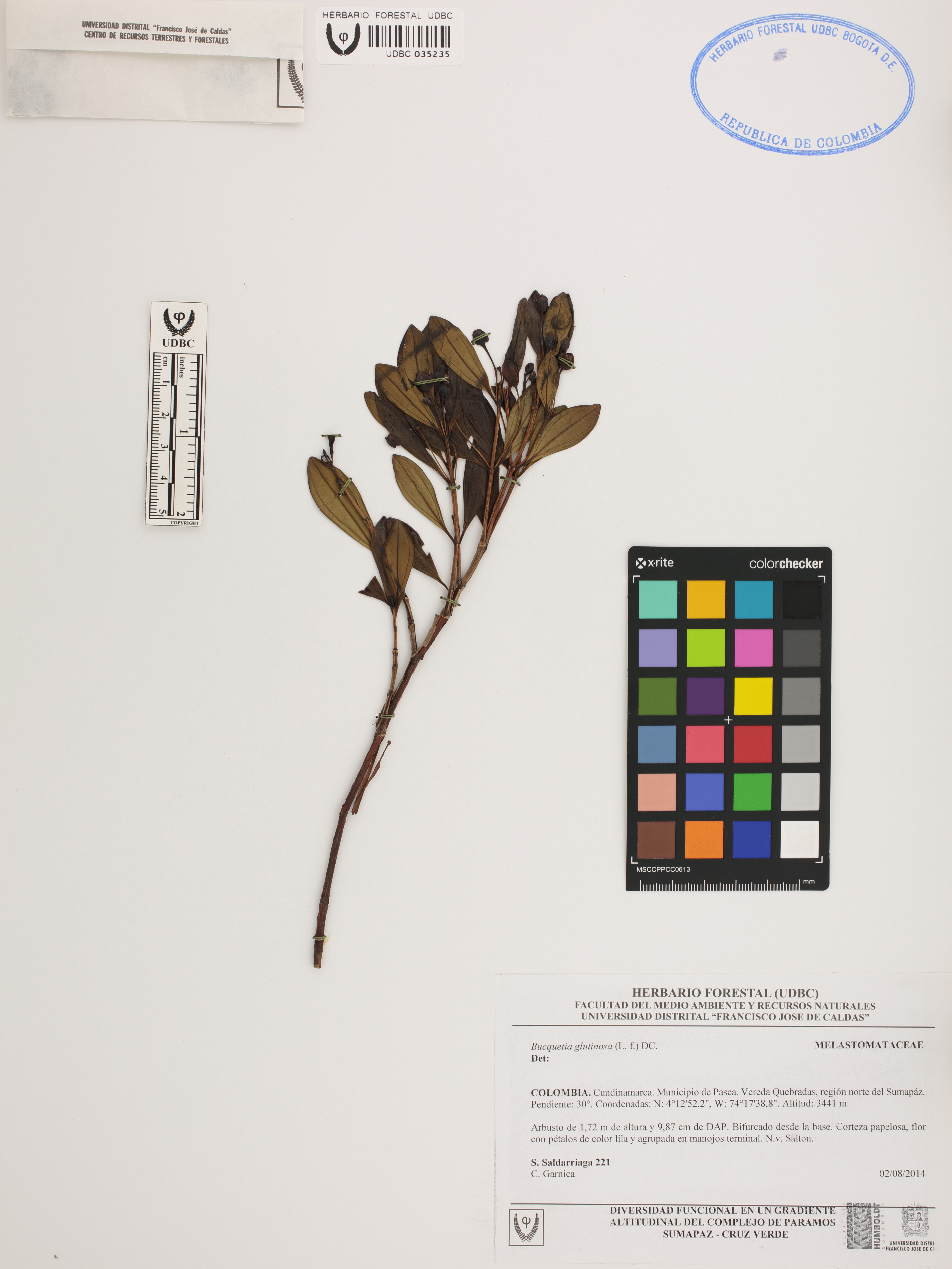 | dc.description | Fotografía del ejemplar Saldarriaga, S. 221, determinado como Bucquetia glutinosa | |