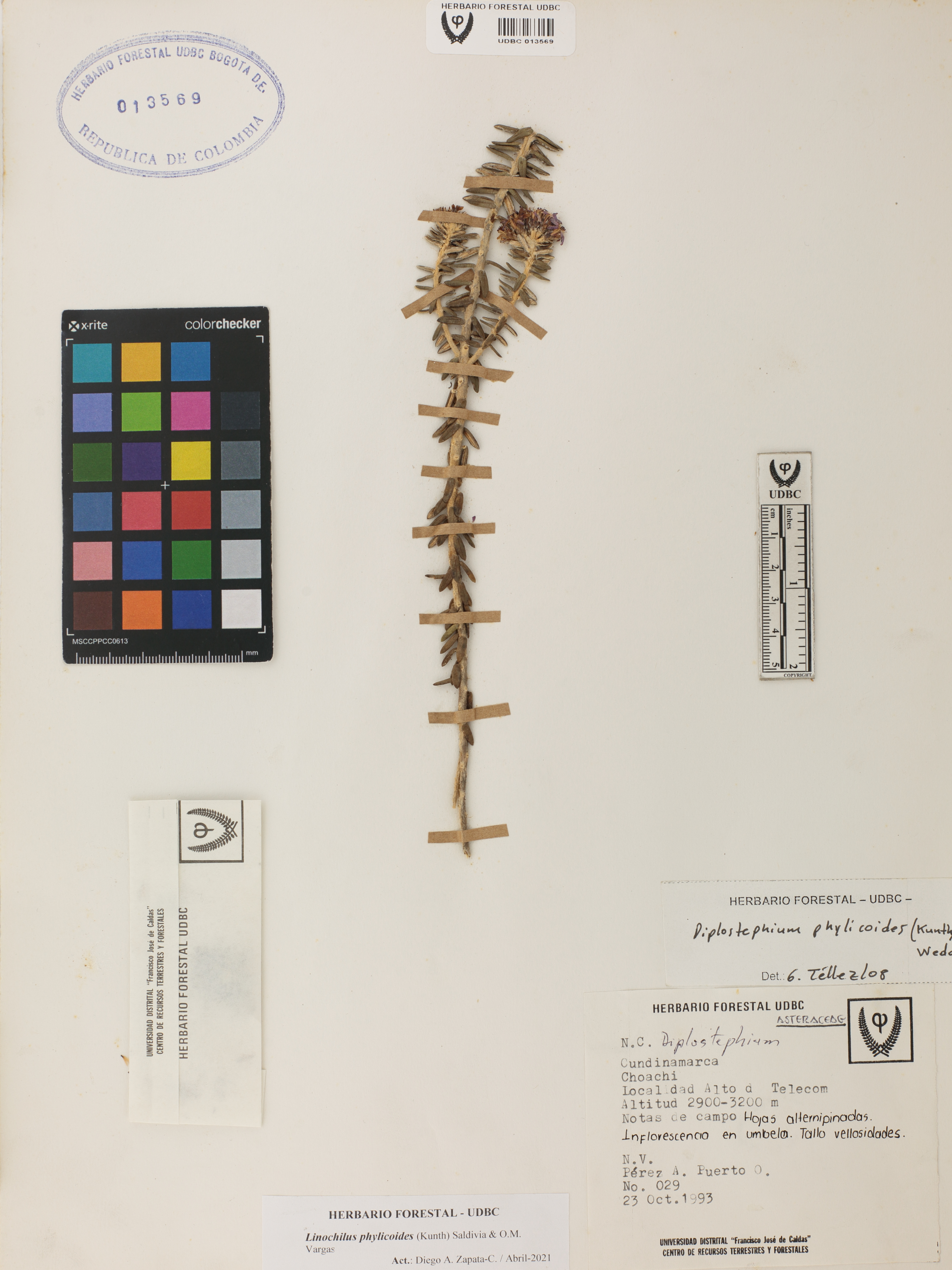 Fotografía del ejemplar Pérez, A. 29, determinado como Linochilus phylicoides en el año 2008