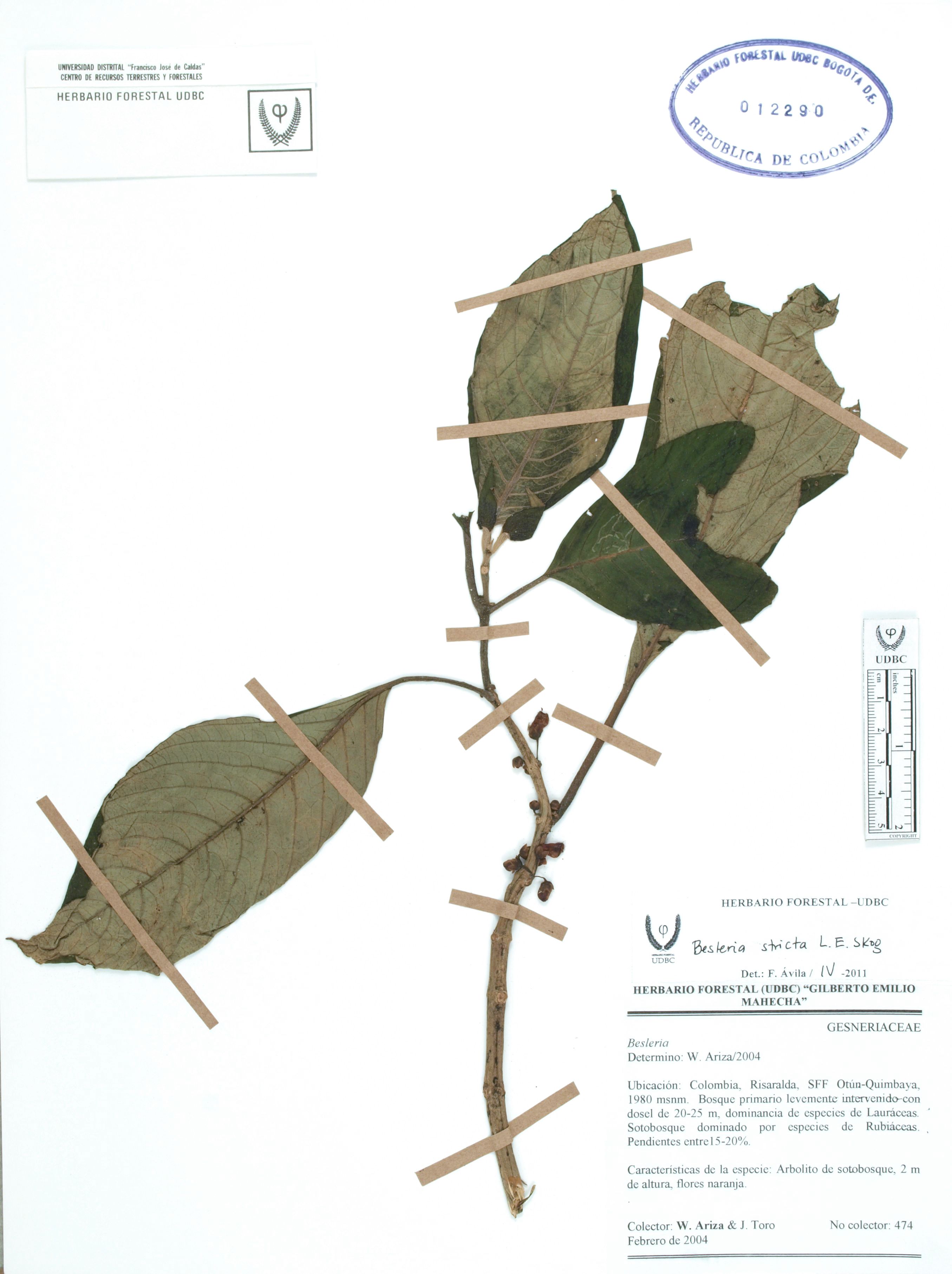 Fotografía del ejemplar Ariza, W. 474, determinado como Besleria stricta en el año 2011