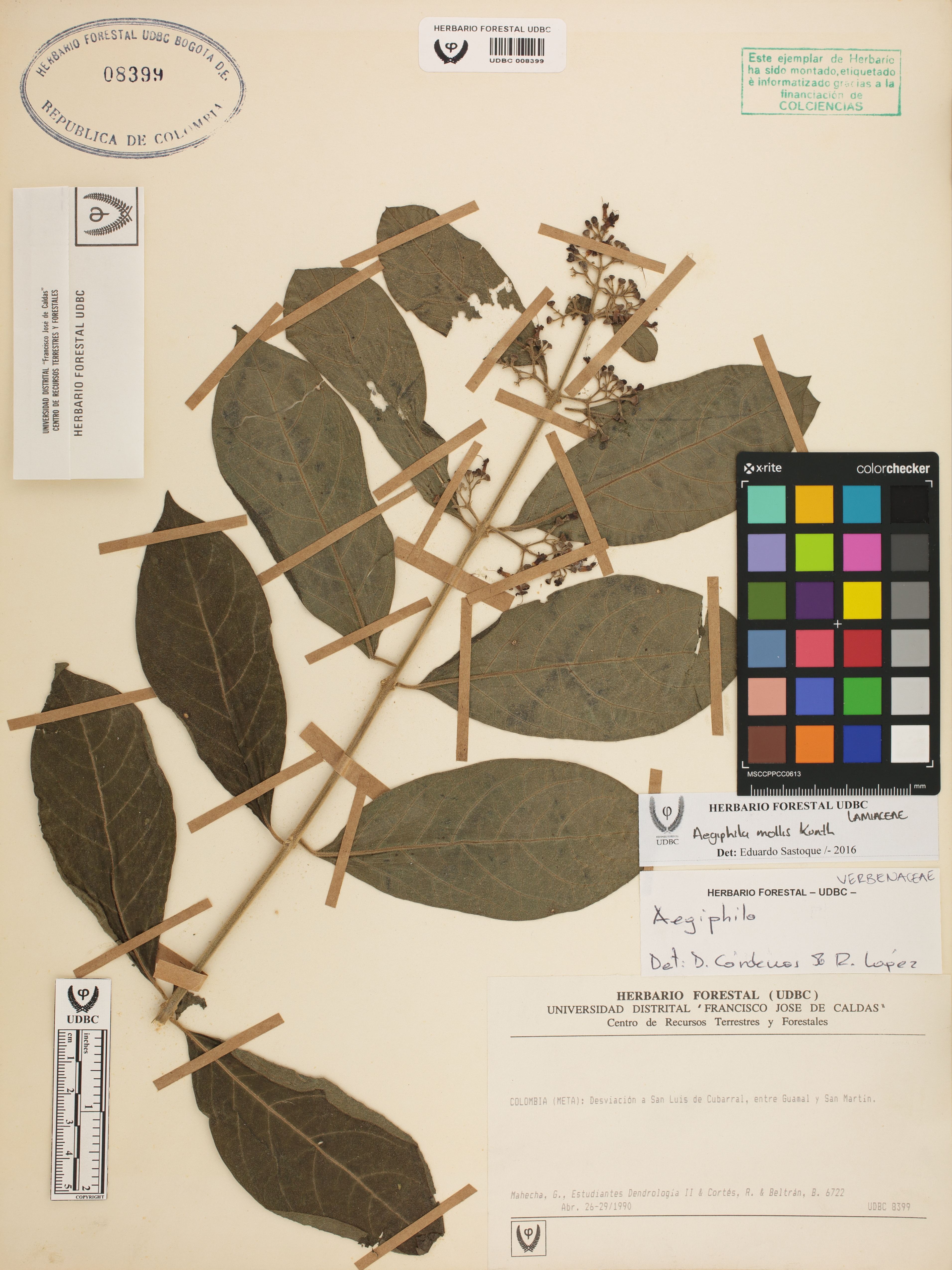 Fotografía del ejemplar Mahecha, G. 6722, determinado como Aegiphila mollis en el año 2016