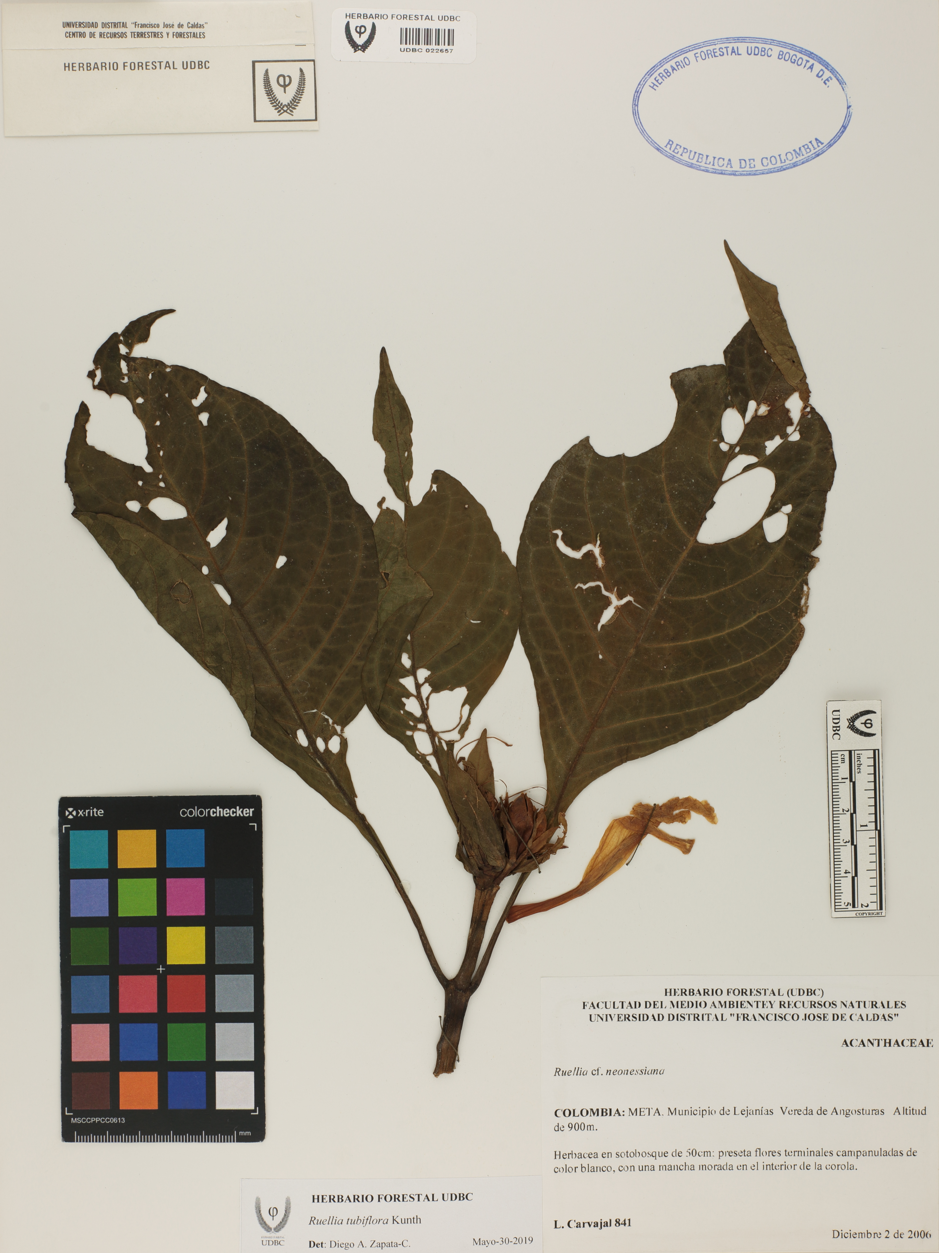 Fotografía del ejemplar Carvajal, L. 841, determinado como Ruellia tubiflora en el año 2019