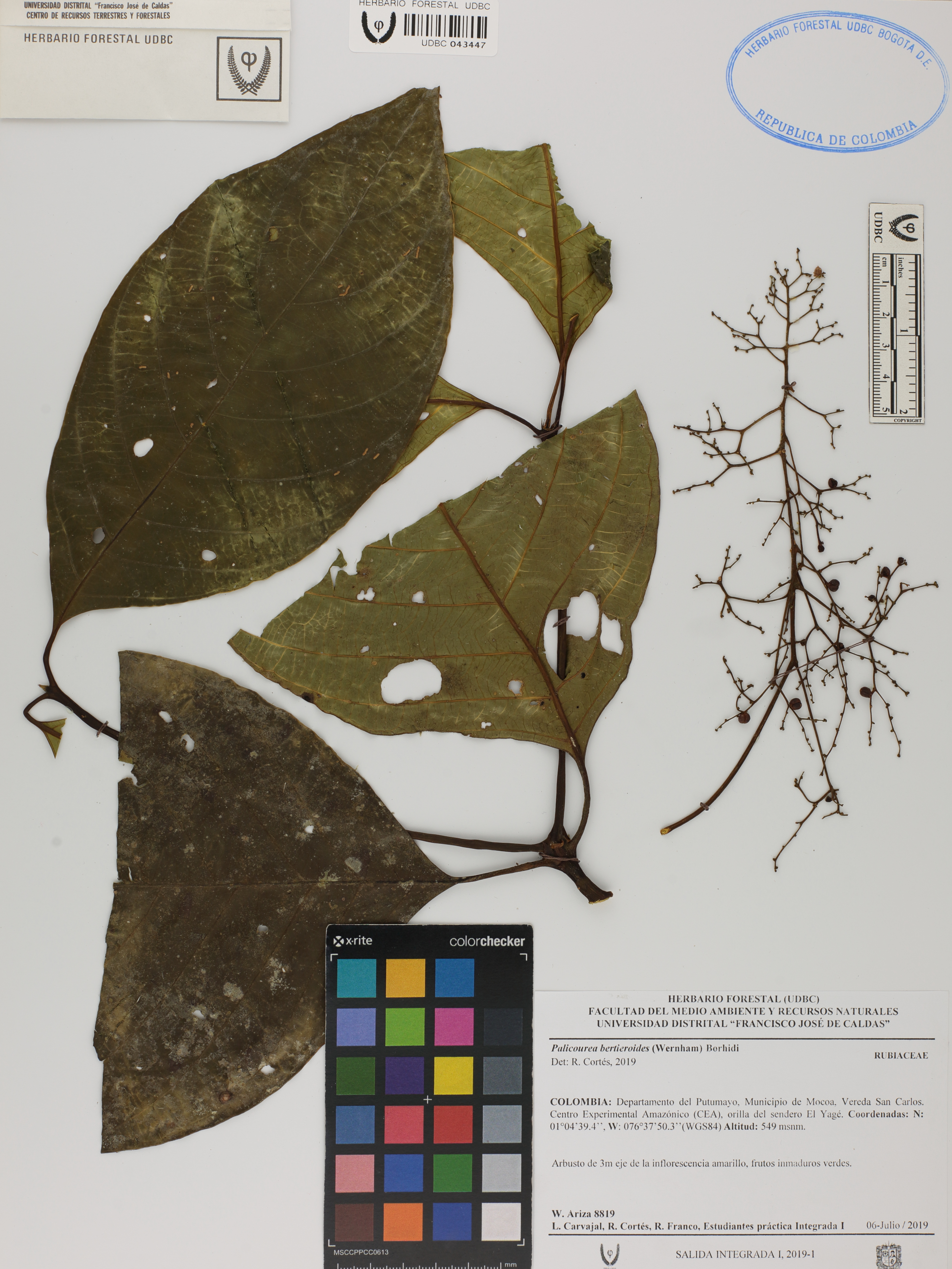 Fotografía del ejemplar Ariza, W. 8819, determinado como Palicourea bertieroides en el año 2019