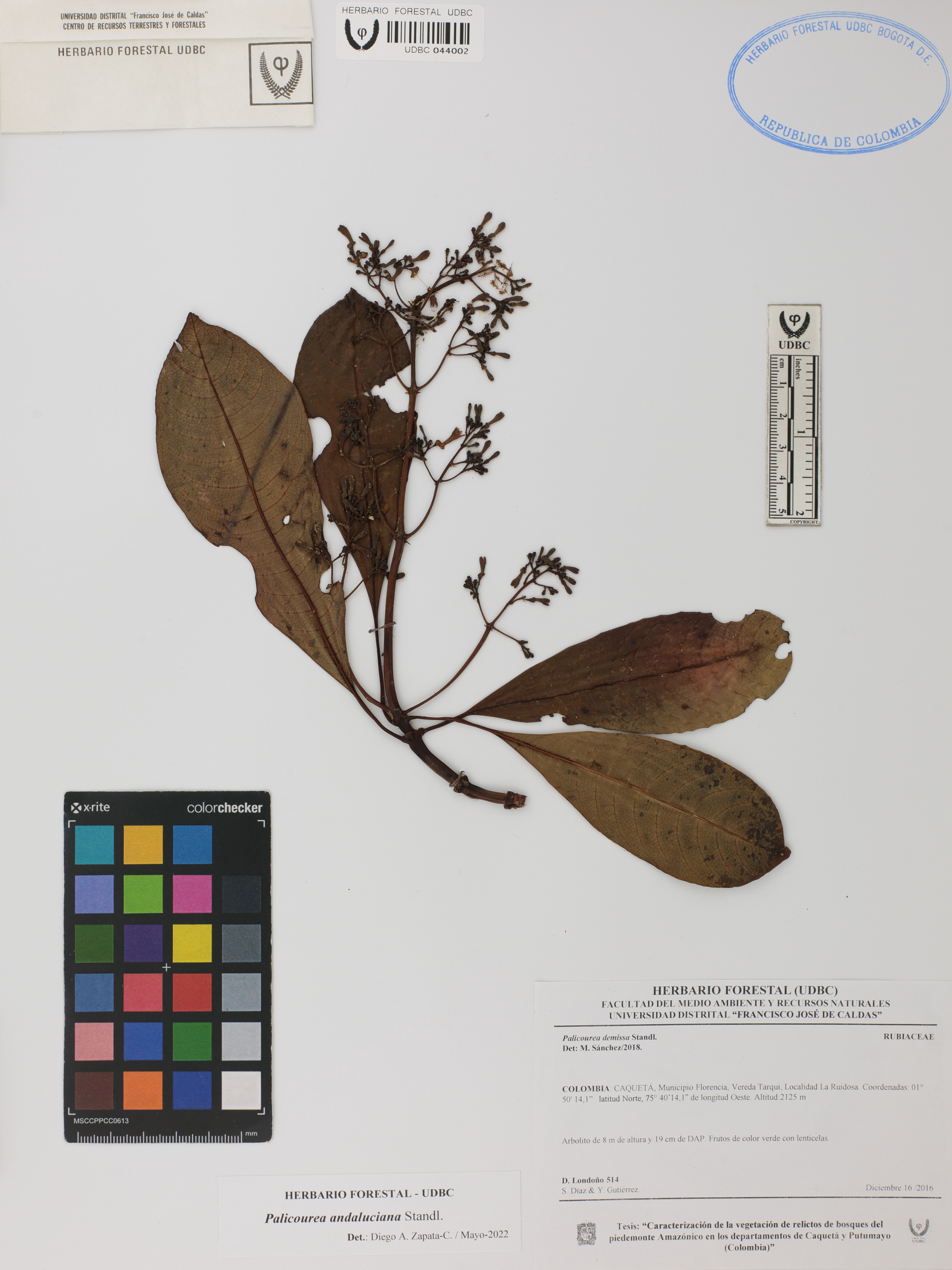Fotografía del ejemplar Londoño, D. 514, determinado como Palicourea andaluciana en el año 2022