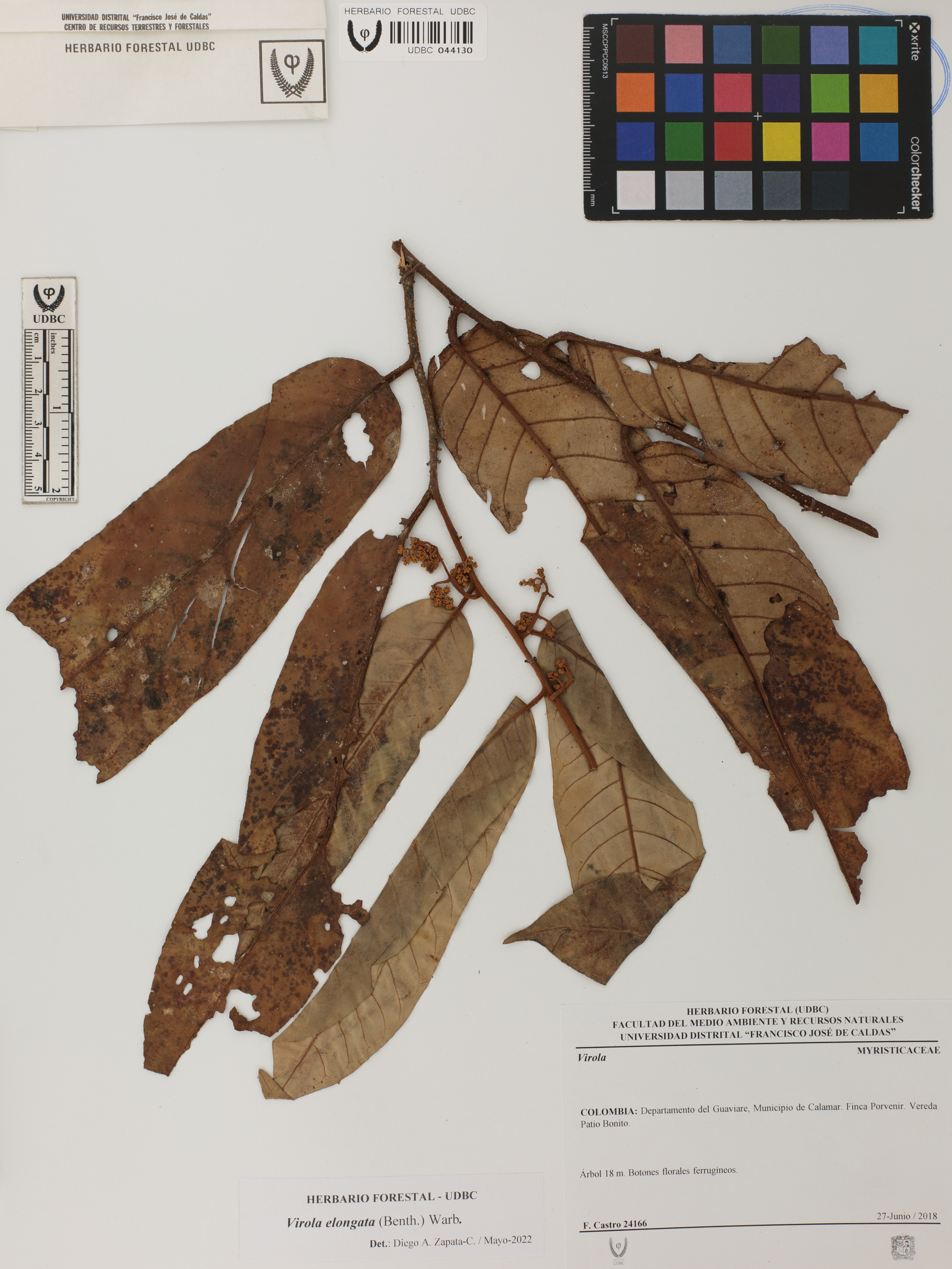 Fotografía del ejemplar Castro, F. 24166, determinado como Virola elongata en el año 2022