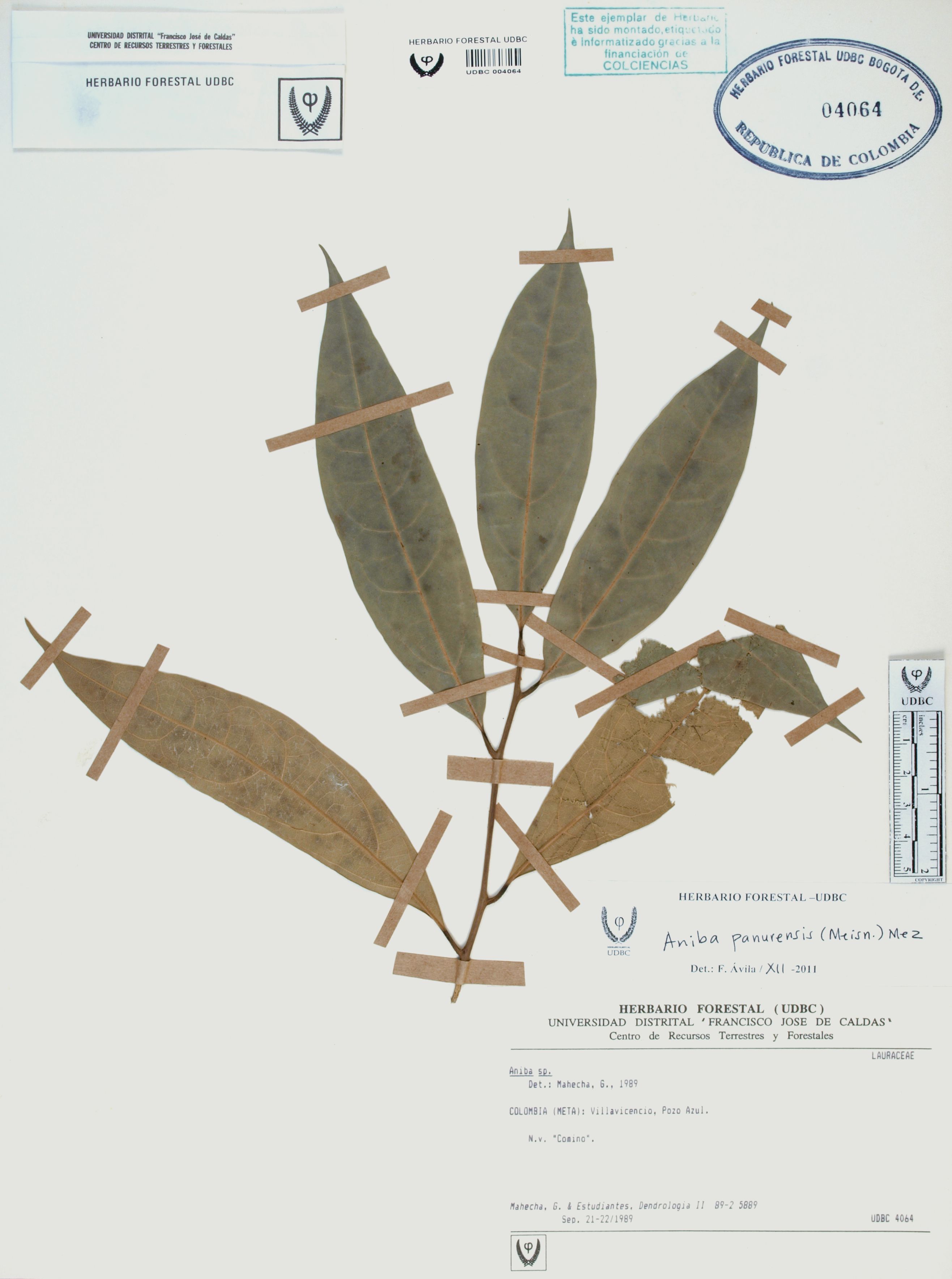 Fotografía del ejemplar Mahecha, G. 5889, determinado como Aniba panurensis en el año 2011