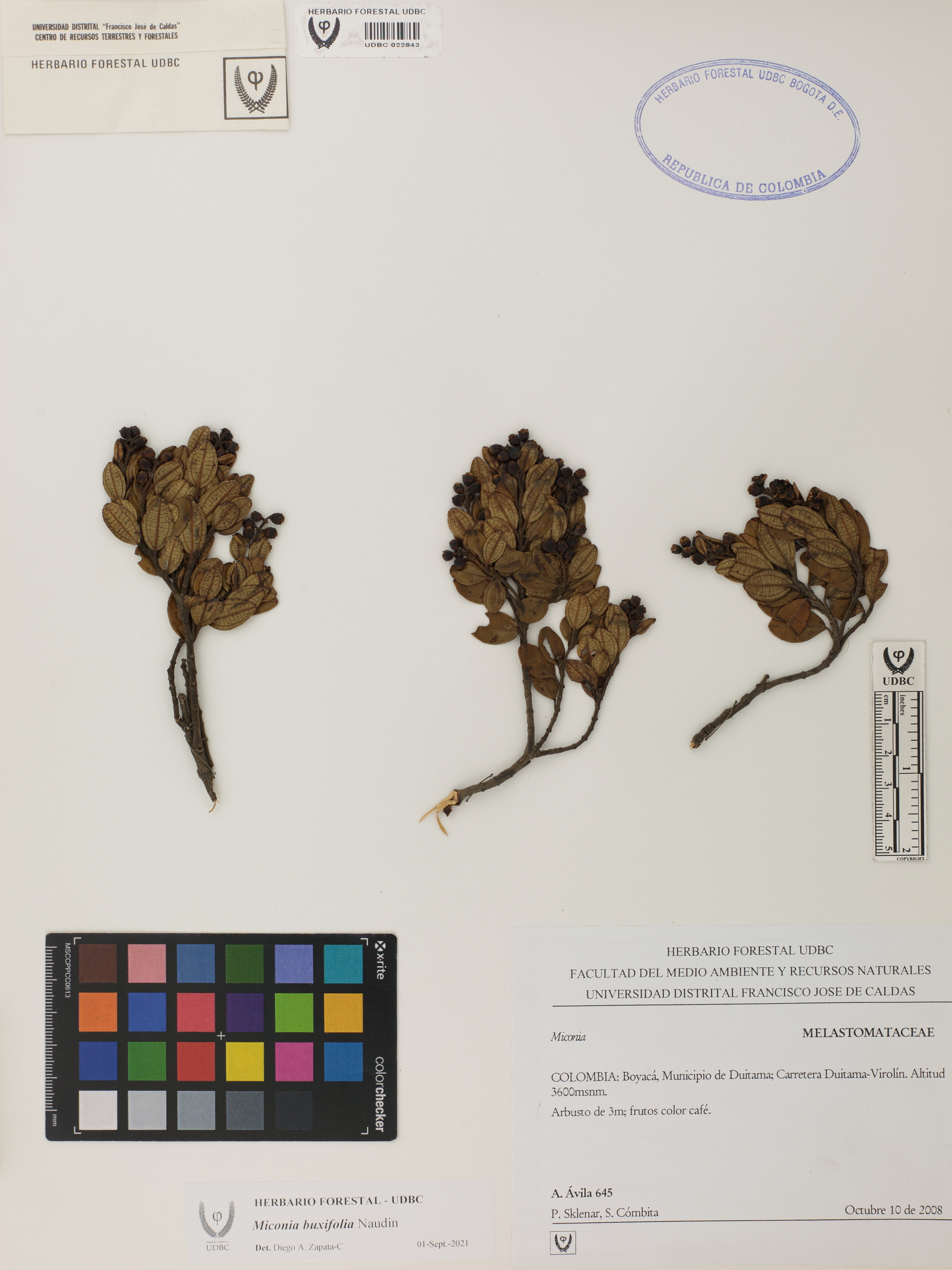 | dc.description | Fotografía del ejemplar Ávila, F. 645, determinado como Miconia buxifolia en el año 2021 | |
