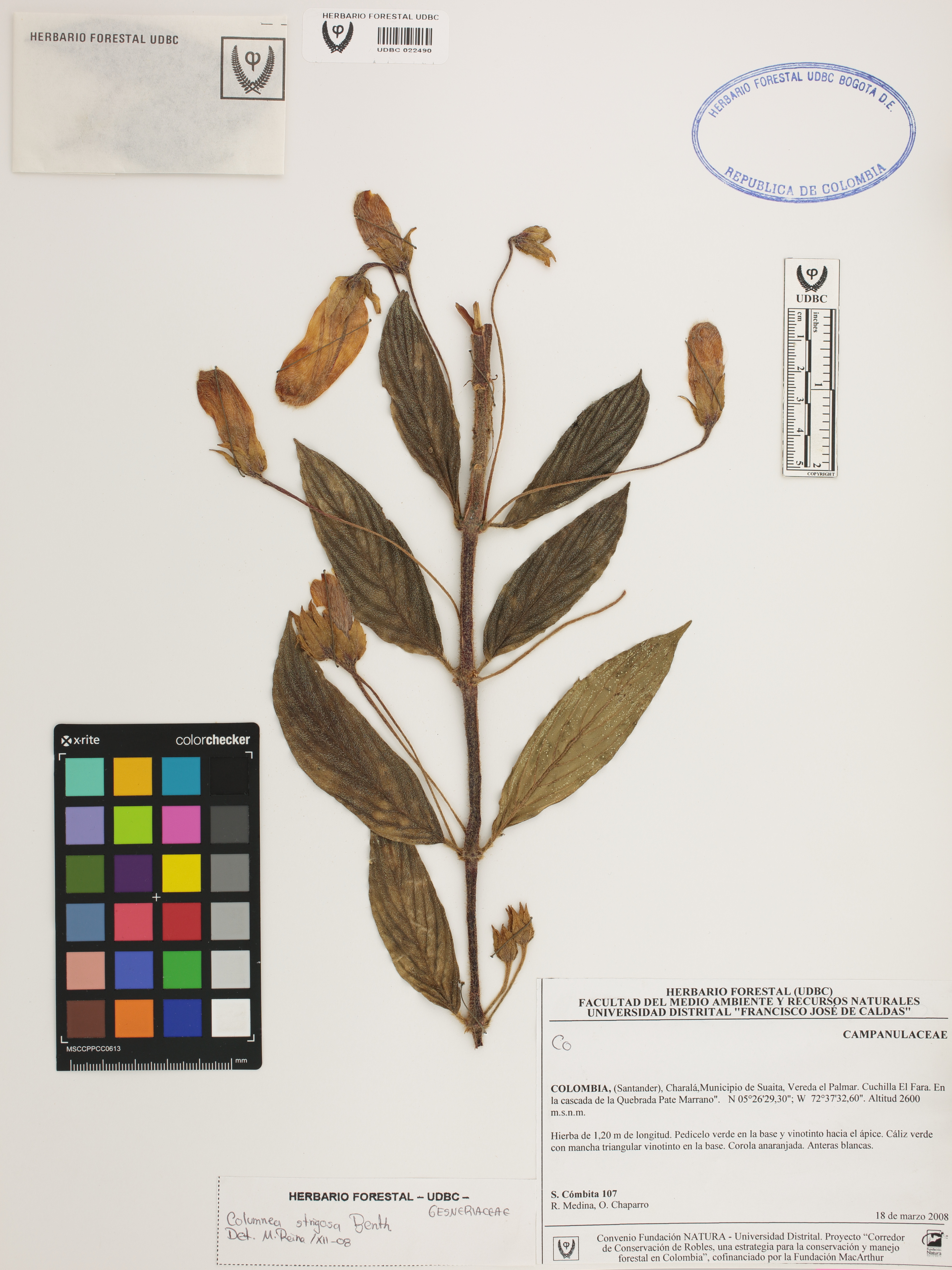 Fotografía del ejemplar Cómbita, S. 107, determinado como Columnea strigosa en el año 2008