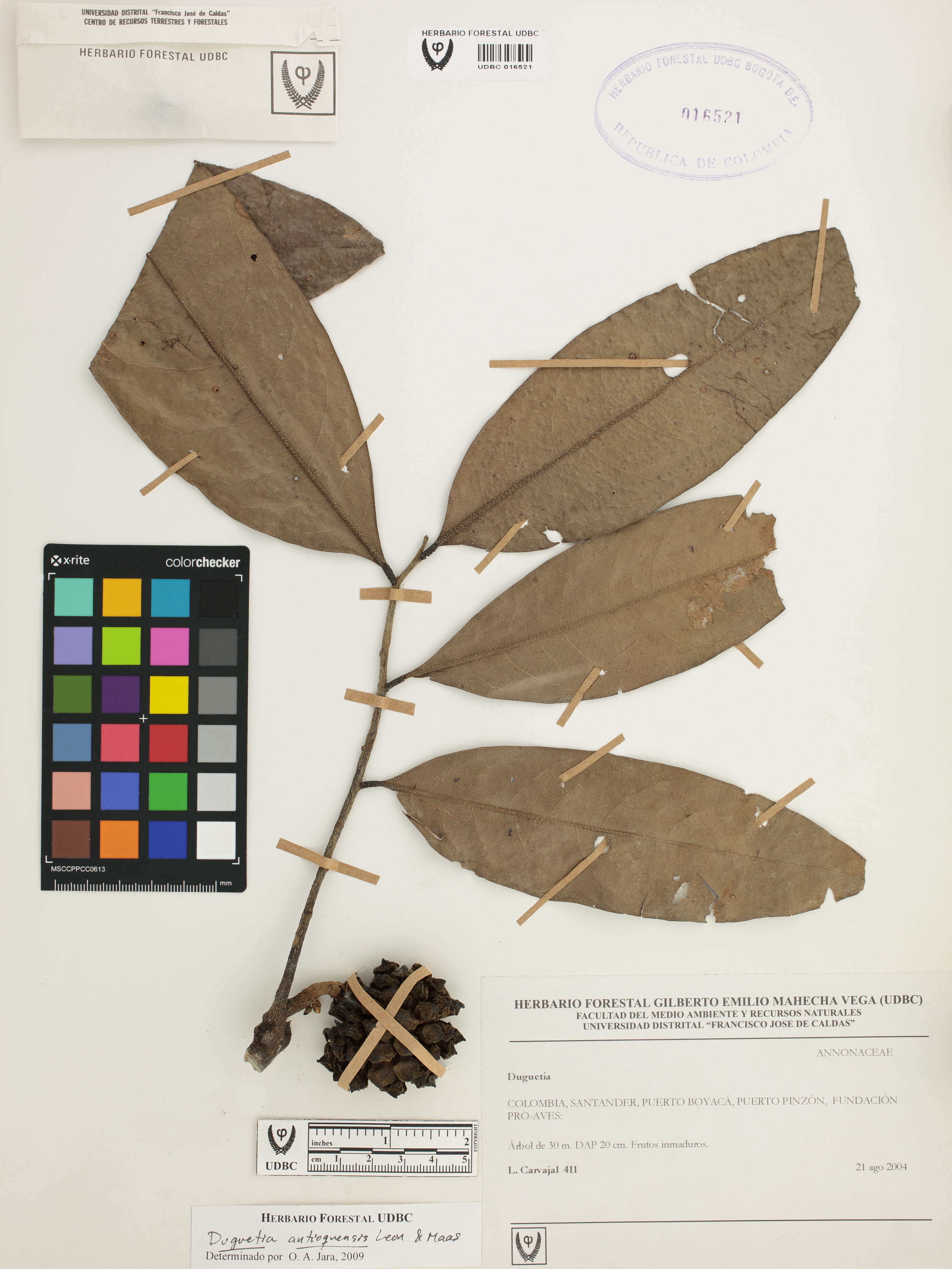 Fotografía del ejemplar Carvajal, L. 411, determinado como Duguetia antioquensis en el año 2009