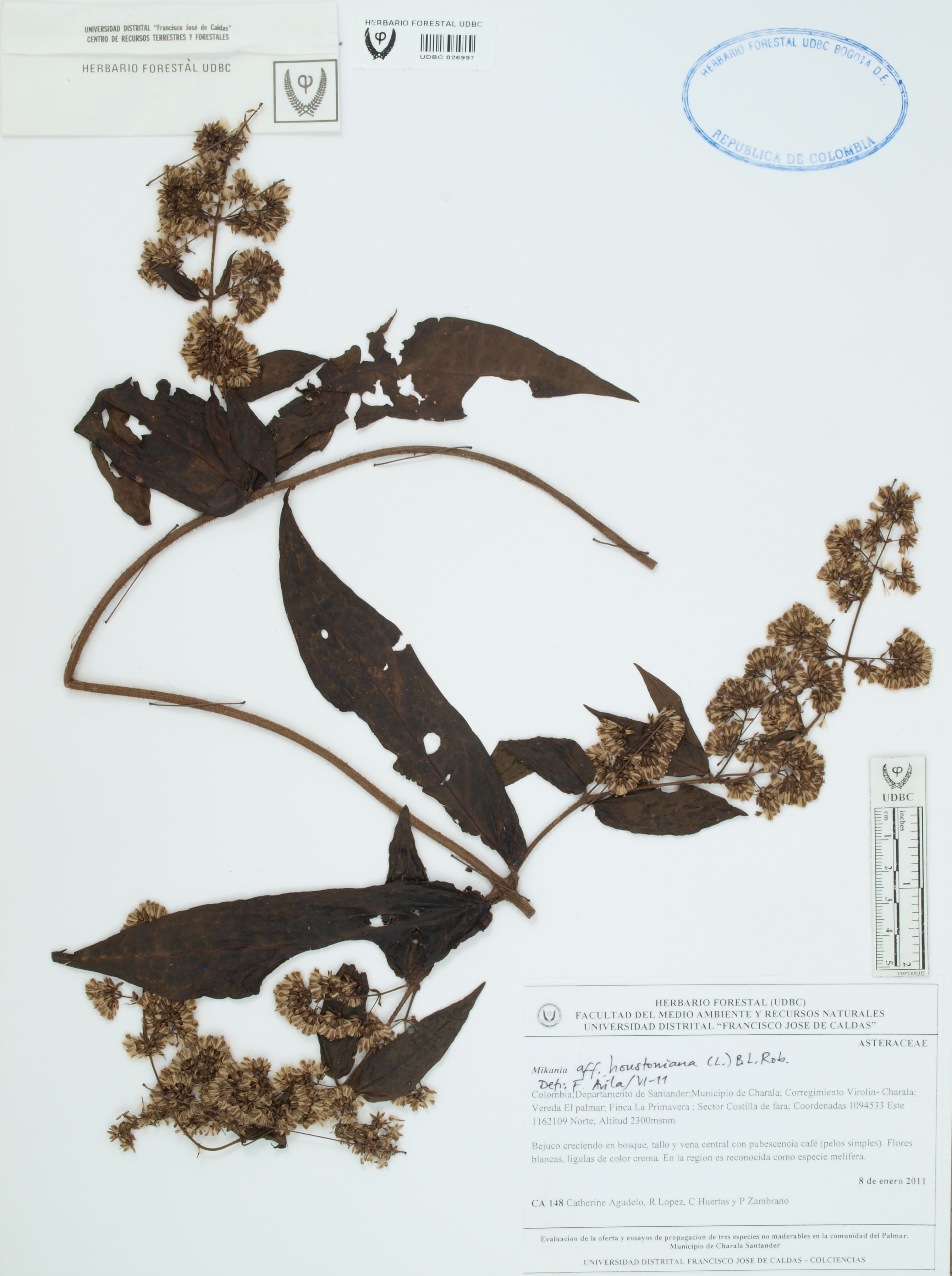Fotografía del ejemplar Agudelo, C. 148, determinado como Mikania houstoniana en el año 2011