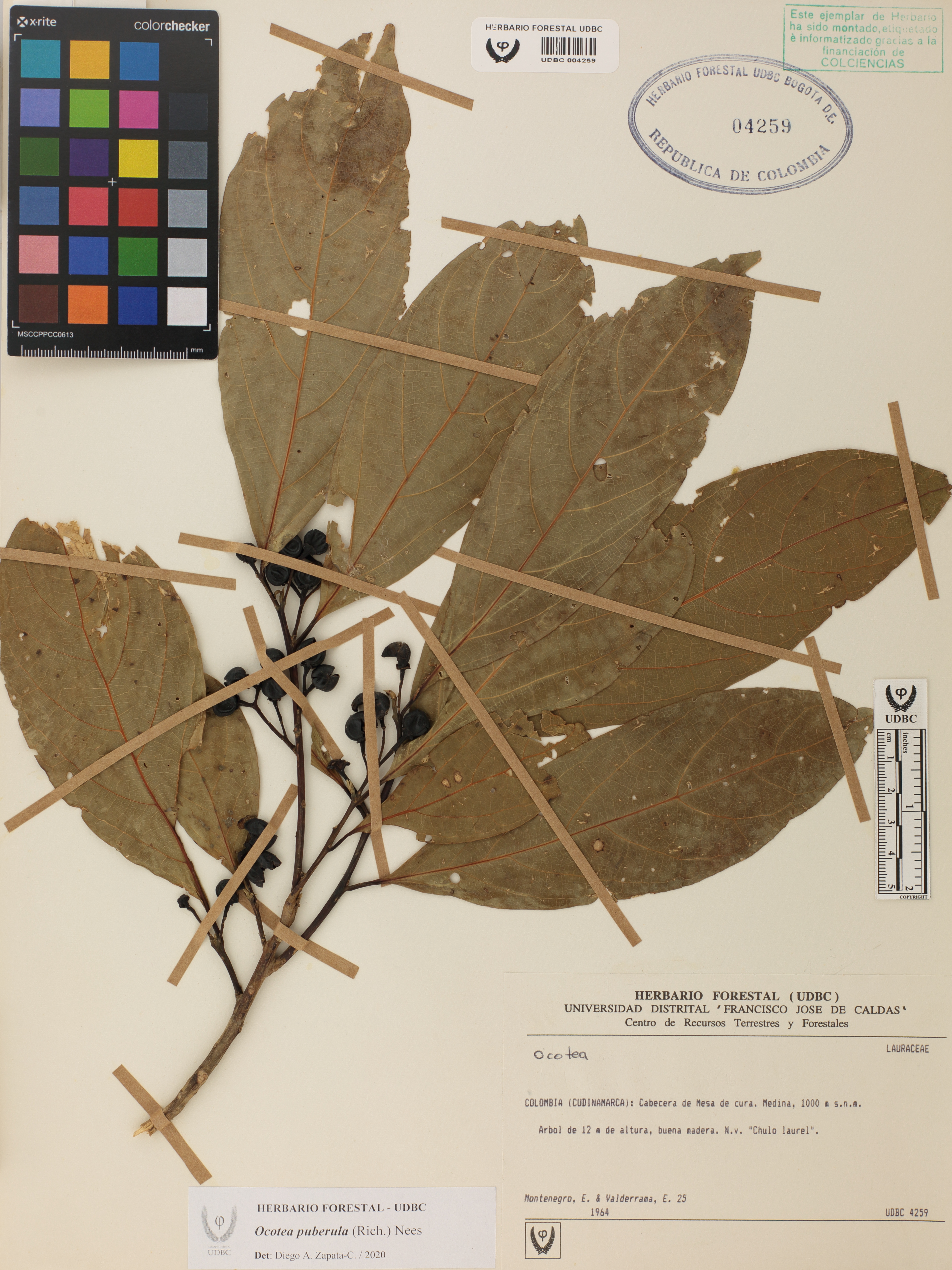Fotografía del ejemplar Montenegro, E. 25, determinado como Ocotea puberula en el año 2020