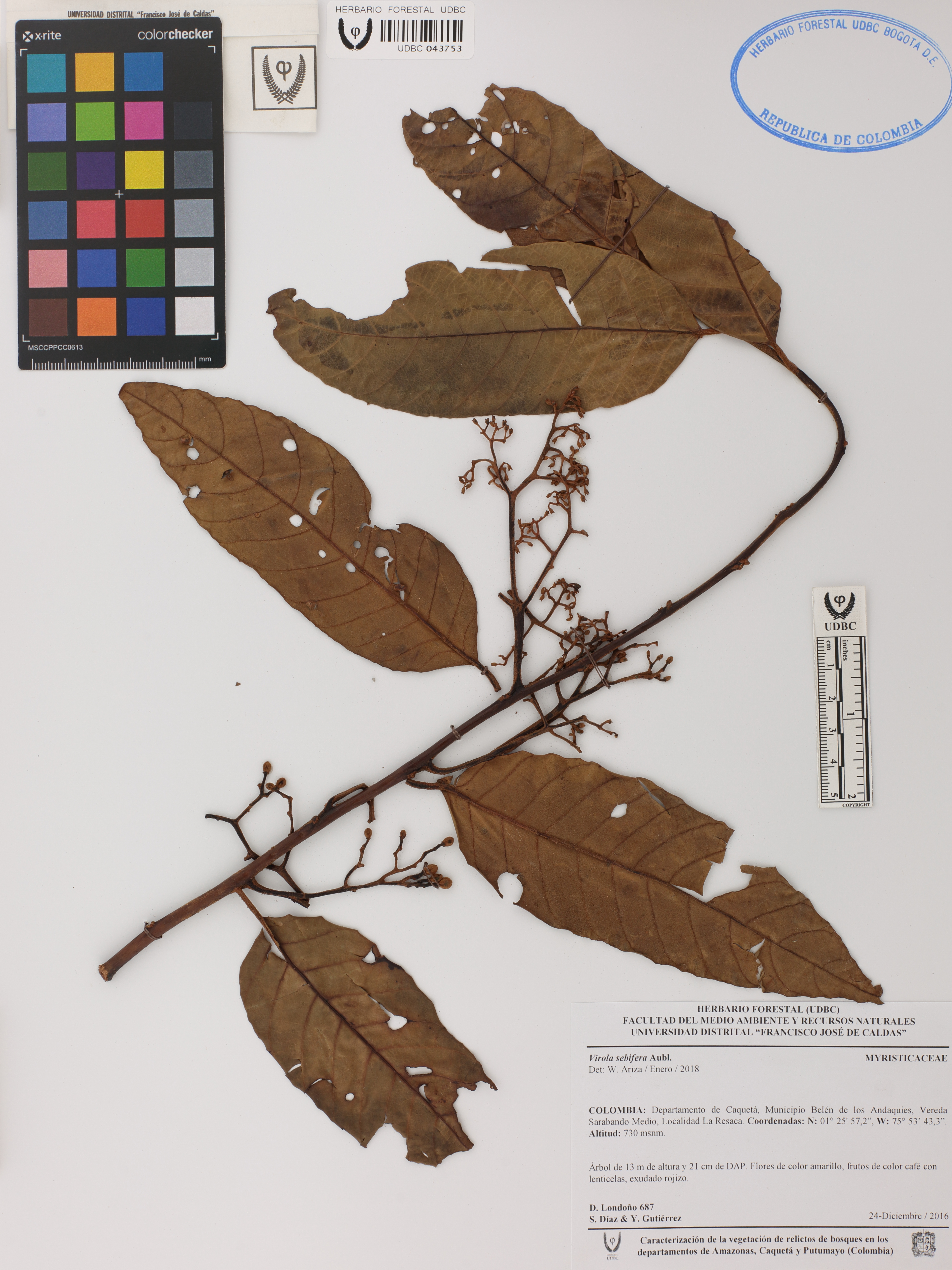 Fotografía del ejemplar Londoño, D. 687, determinado como Virola sebifera en el año 2017