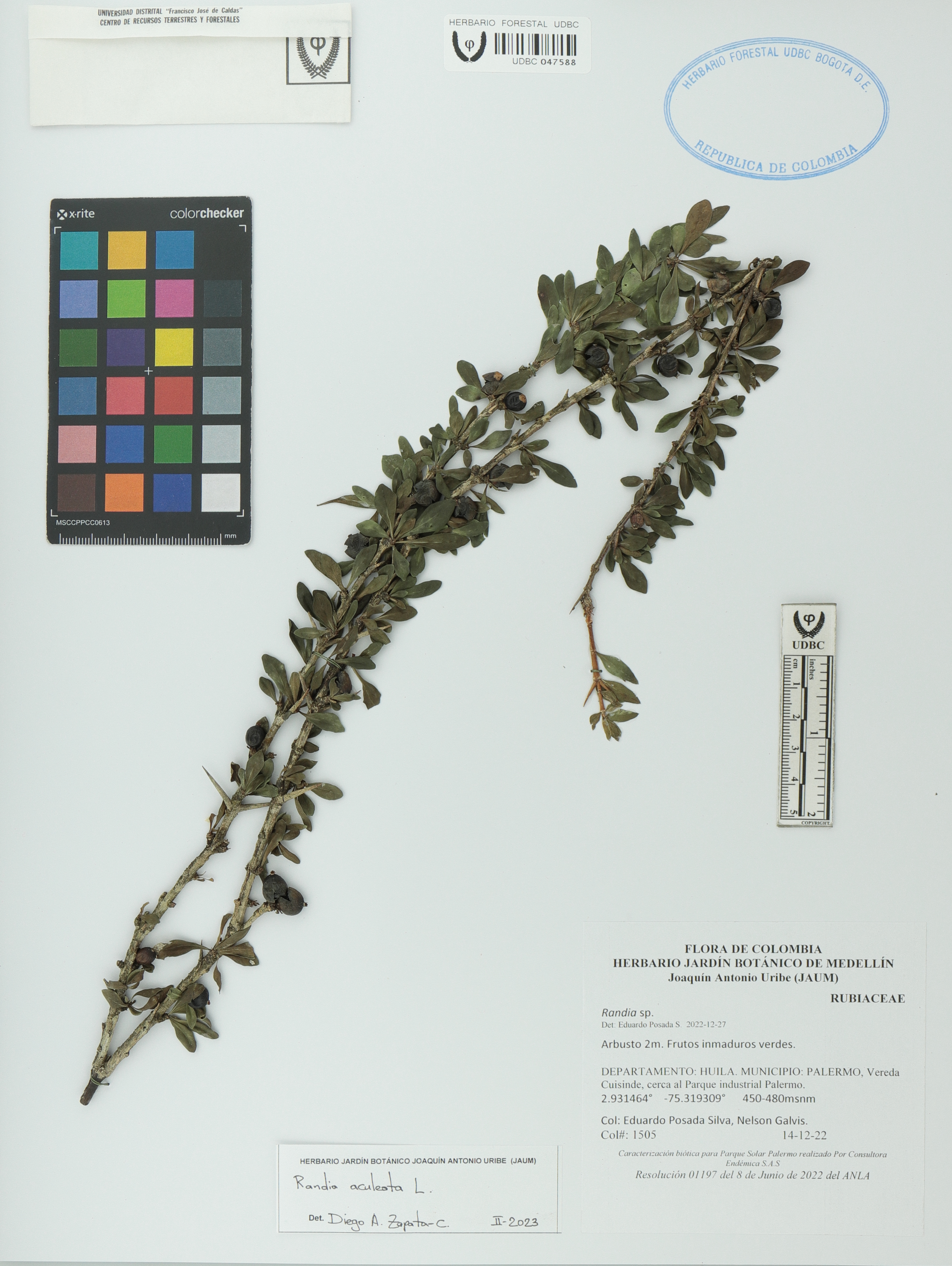 Fotografía del ejemplar Posada-S., E. 1505, determinado como Randia aculeata en el año 2023