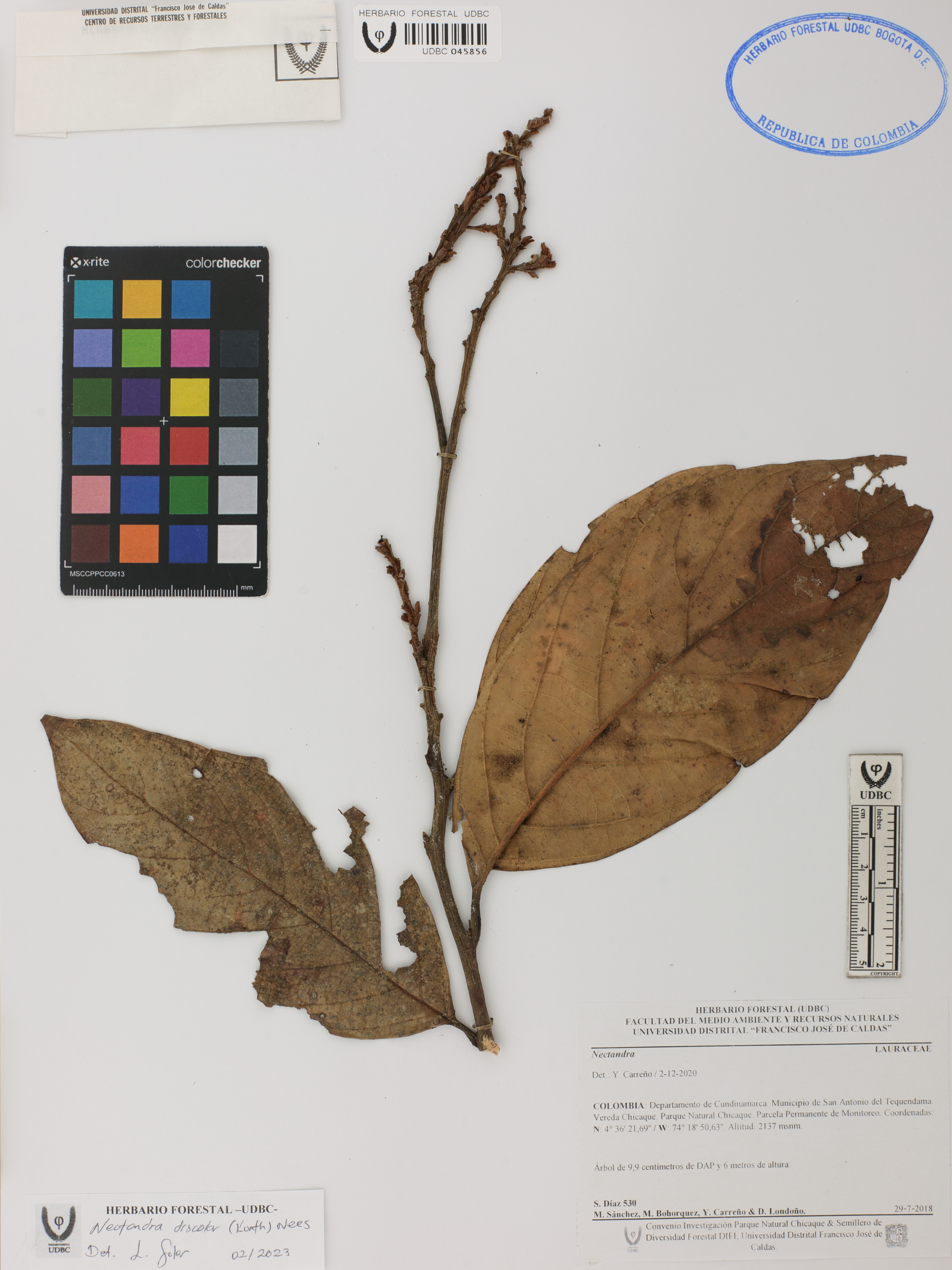 Fotografía del ejemplar Díaz, S. 530, determinado como Nectandra discolor en el año 2023