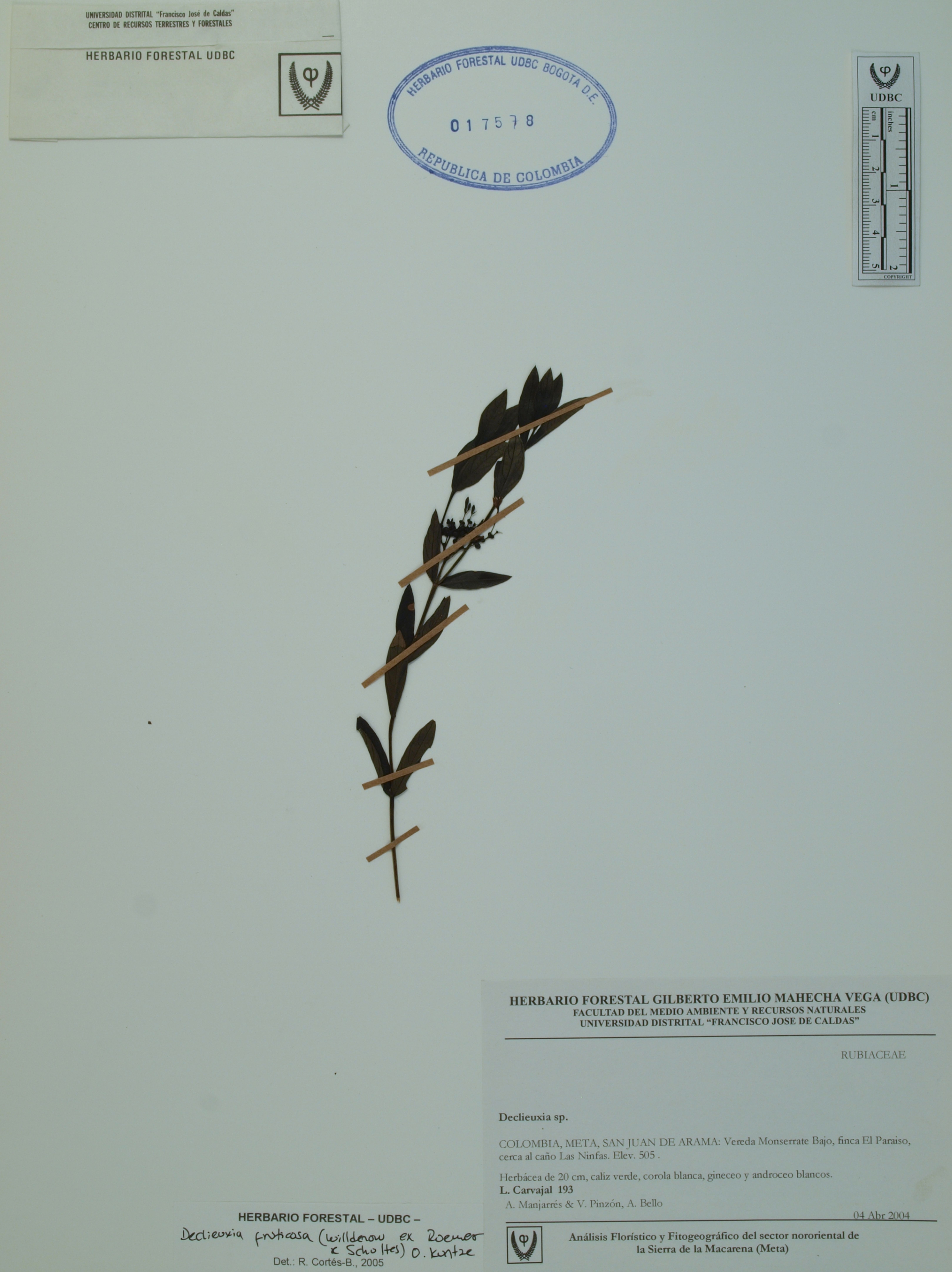 Fotografía del ejemplar Carvajal, L. 193, determinado como Declieuxia fruticosa en el año 2005