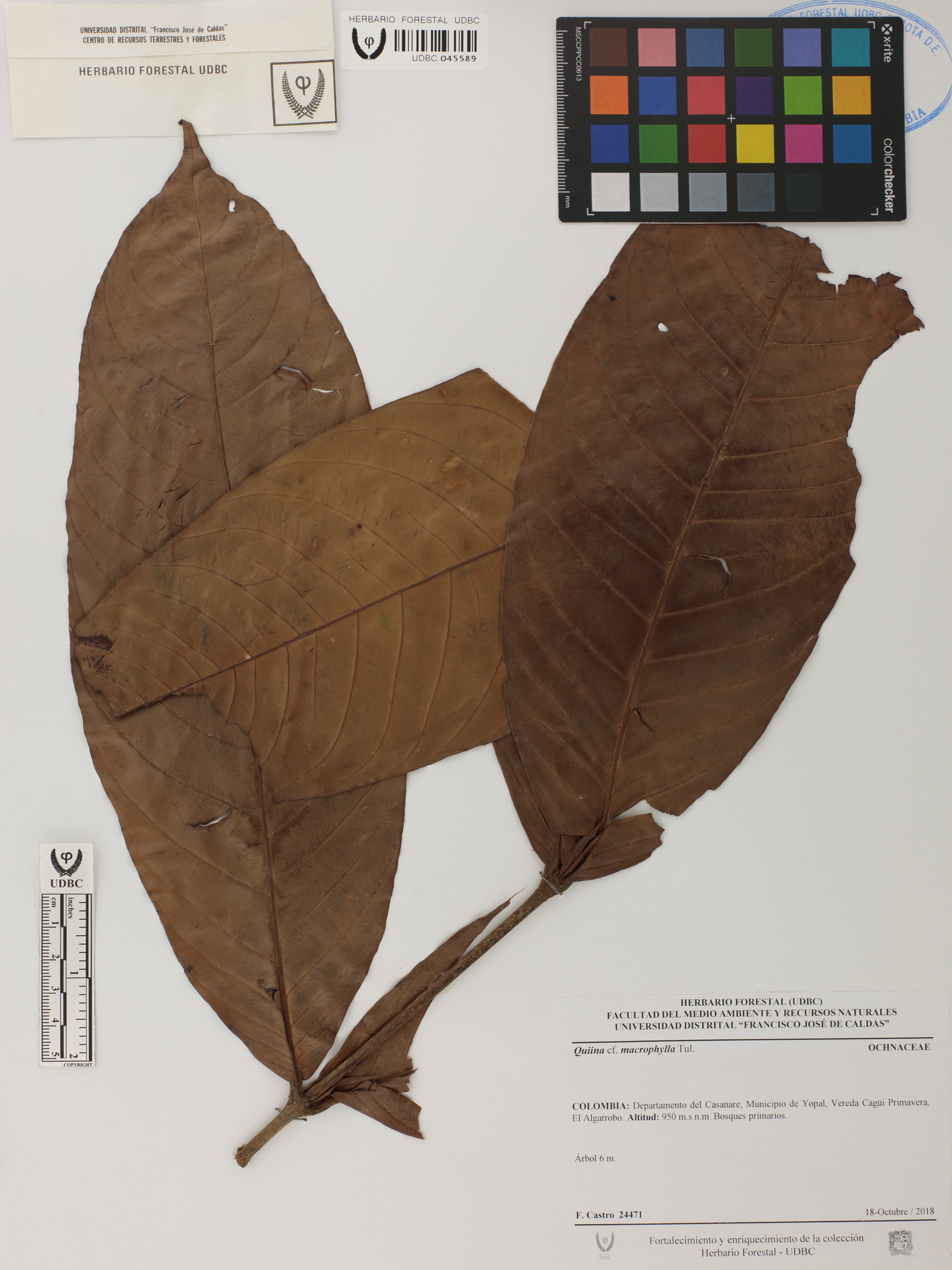 Fotografía del ejemplar Castro, F. 24471, determinado como Quiina macrophylla en el año 2018