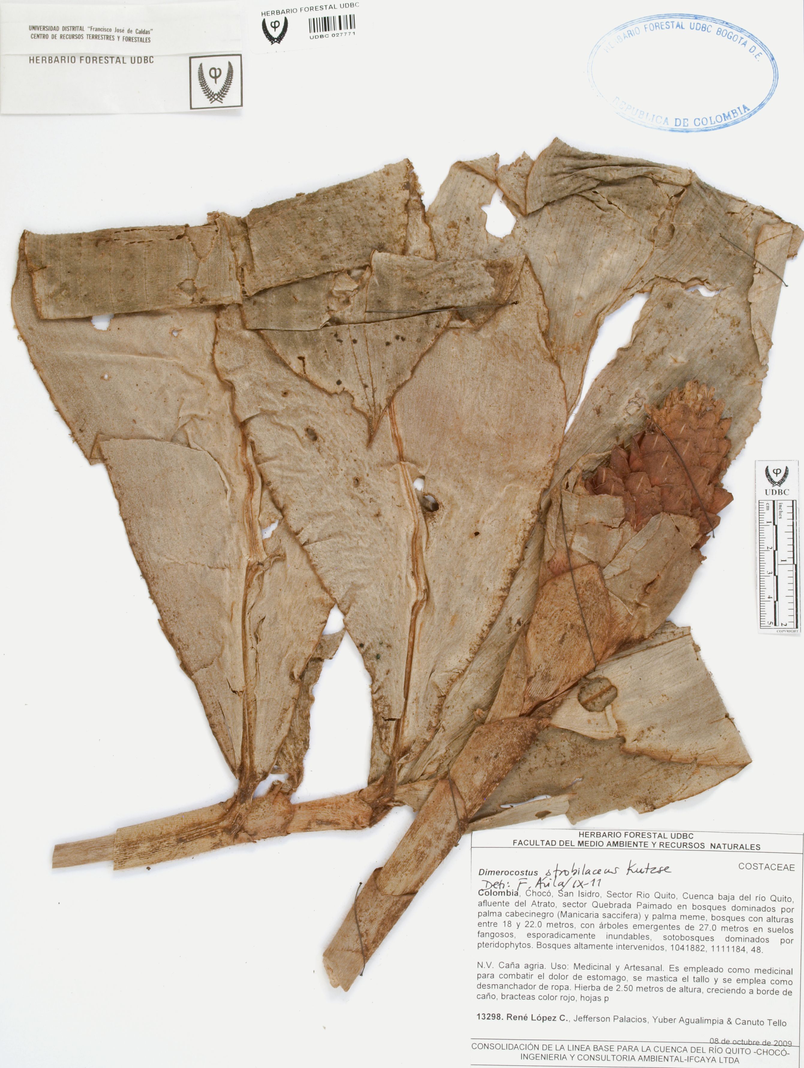 Fotografía del ejemplar López, R. 13298, determinado como Dimerocostus strobilaceus en el año 2011