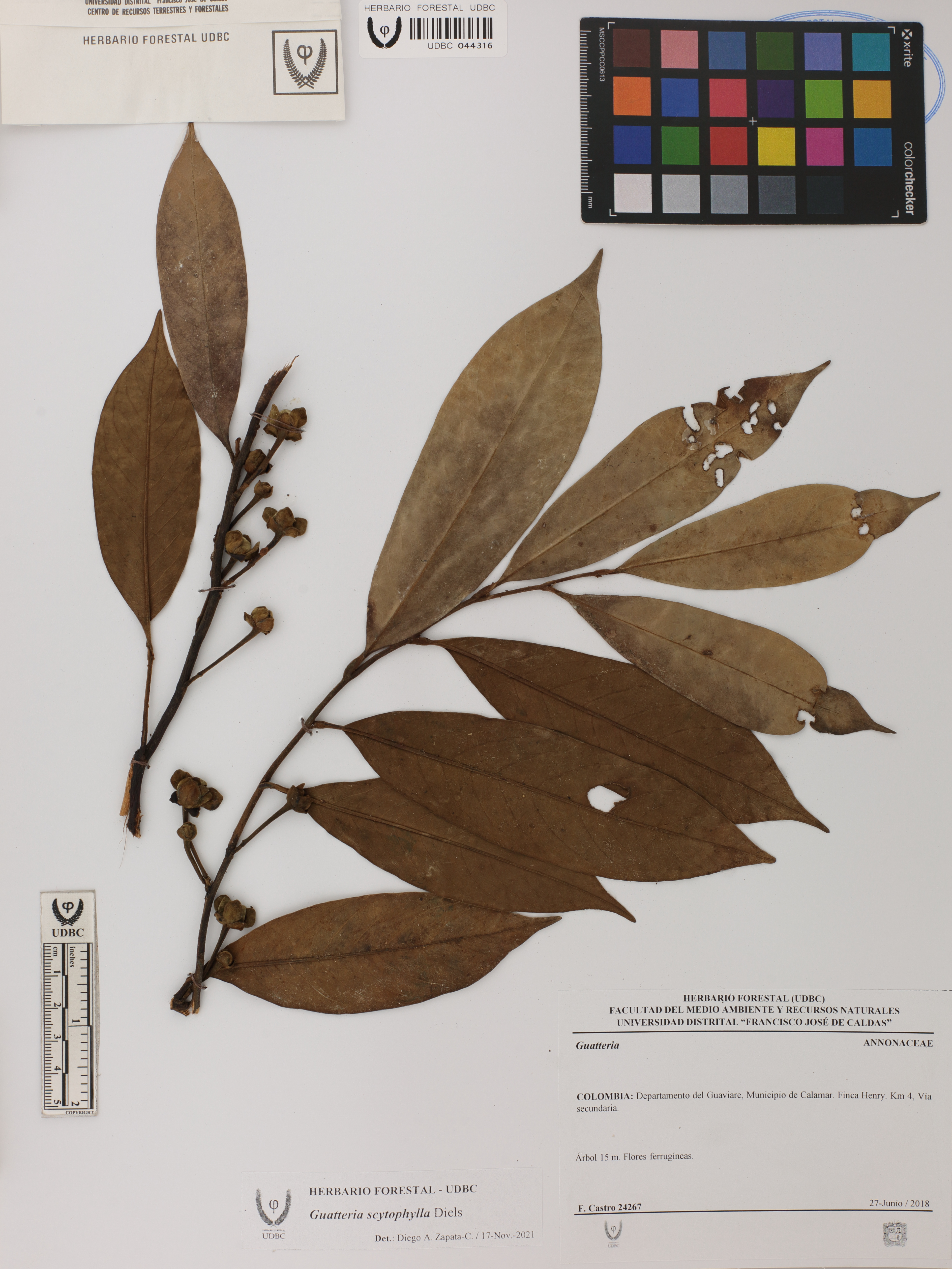 | dc.description | Fotografía del ejemplar Castro, F. 24267, determinado como Guatteria scytophylla en el año 2021 | |