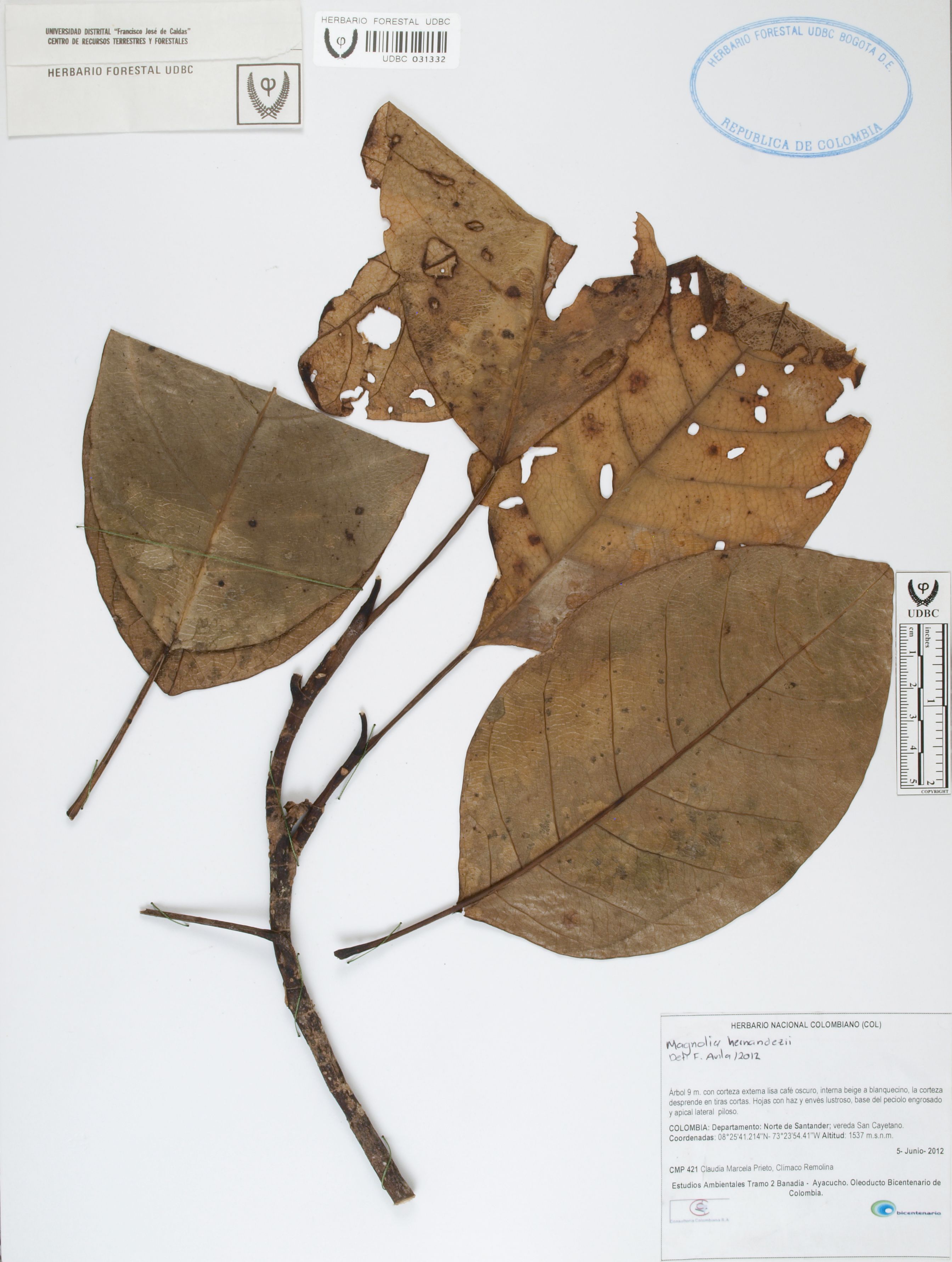 Fotografía del ejemplar Prieto, C. 421, determinado como Magnolia hernandezii en el año 2012