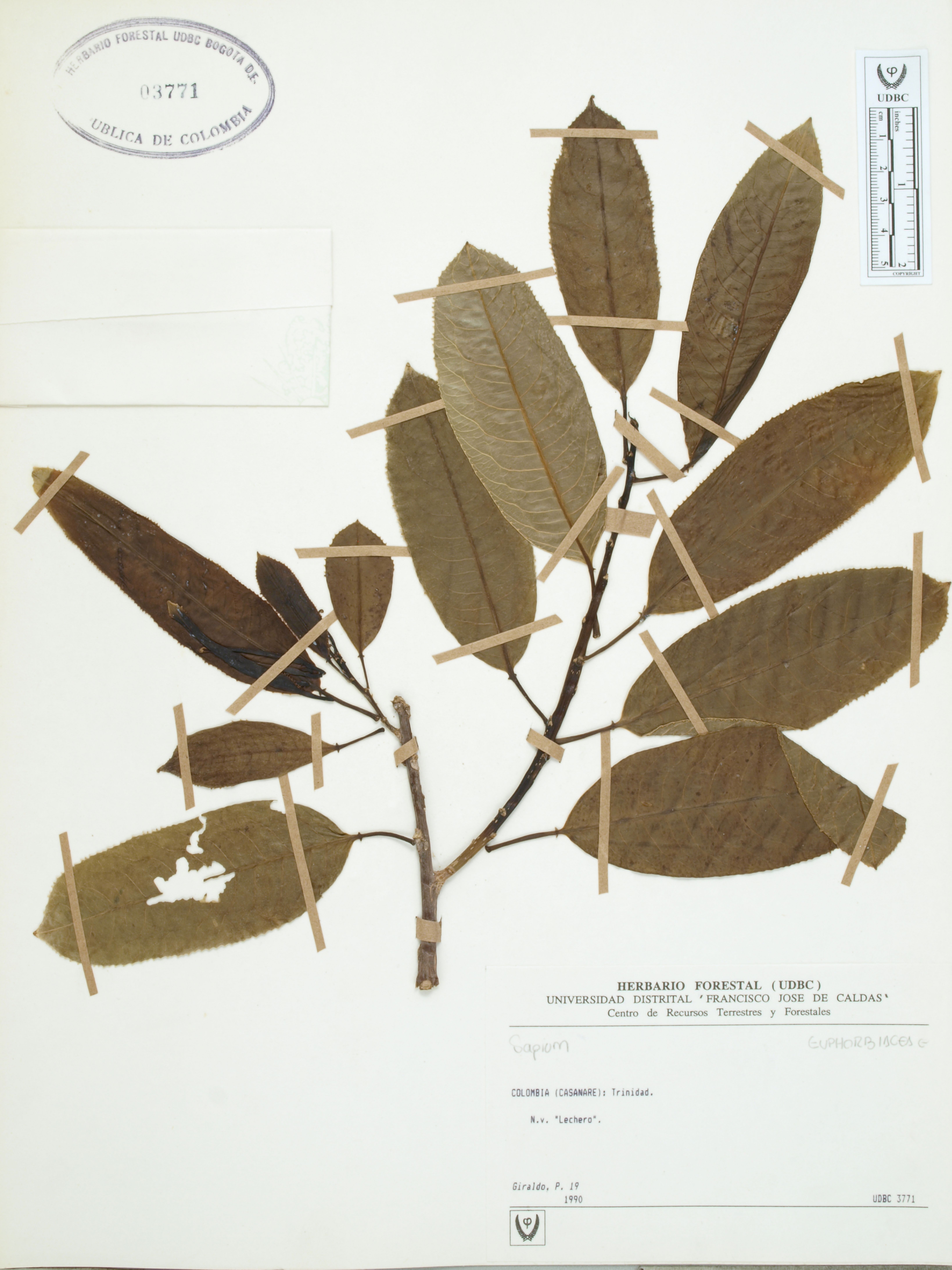 Fotografía del ejemplar Giraldo, P. 21, determinado como Sapium sp.