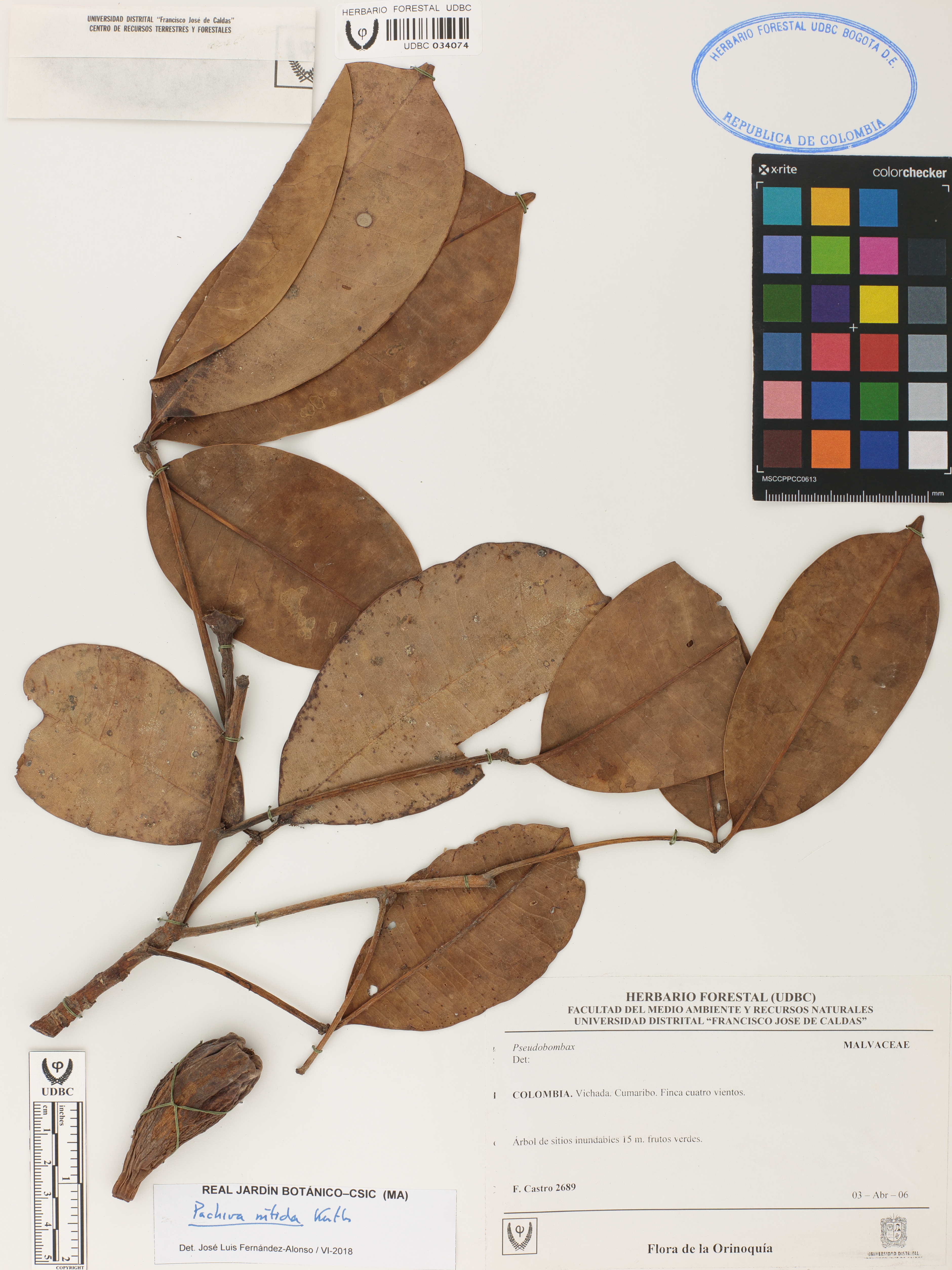 Fotografía del ejemplar Castro, F. 2689, determinado como Pachira nitida en el año 2018