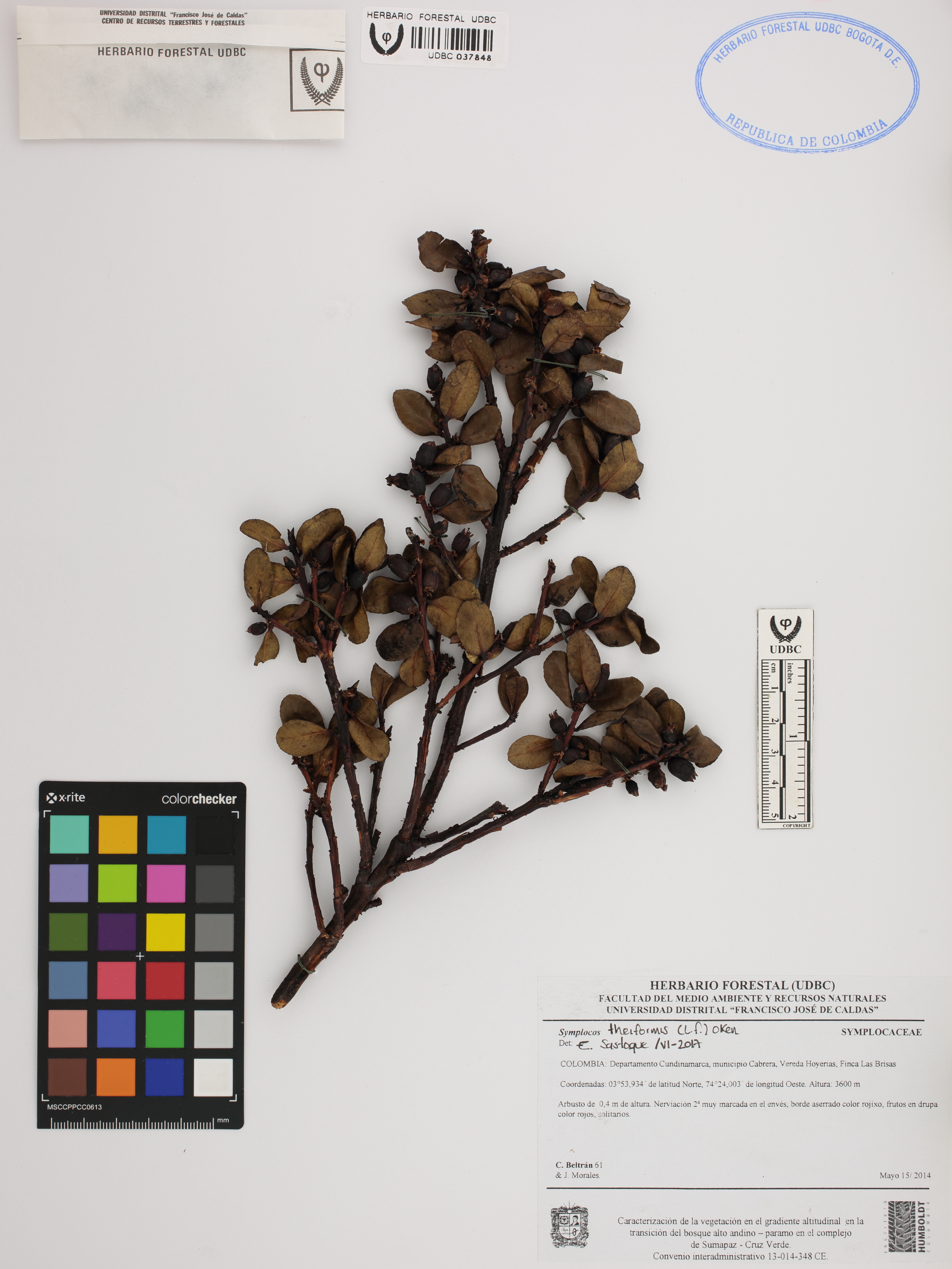 Fotografía del ejemplar Beltrán, C. 61, determinado como Symplocos theiformis en el año 2017