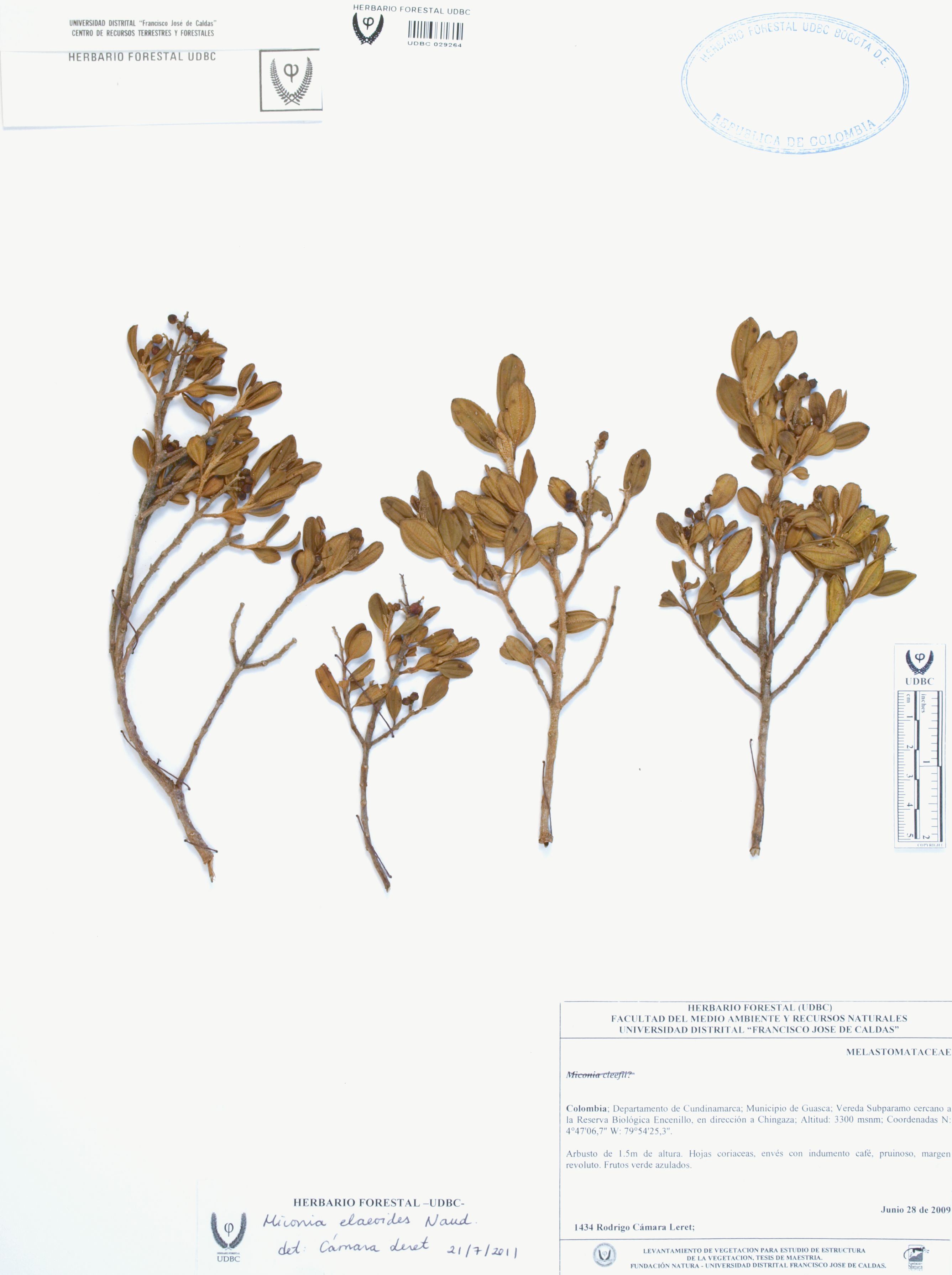 | dc.description | Fotografía del ejemplar Cámara, R. 1434, determinado como Miconia elaeoides en el año 2011 | |